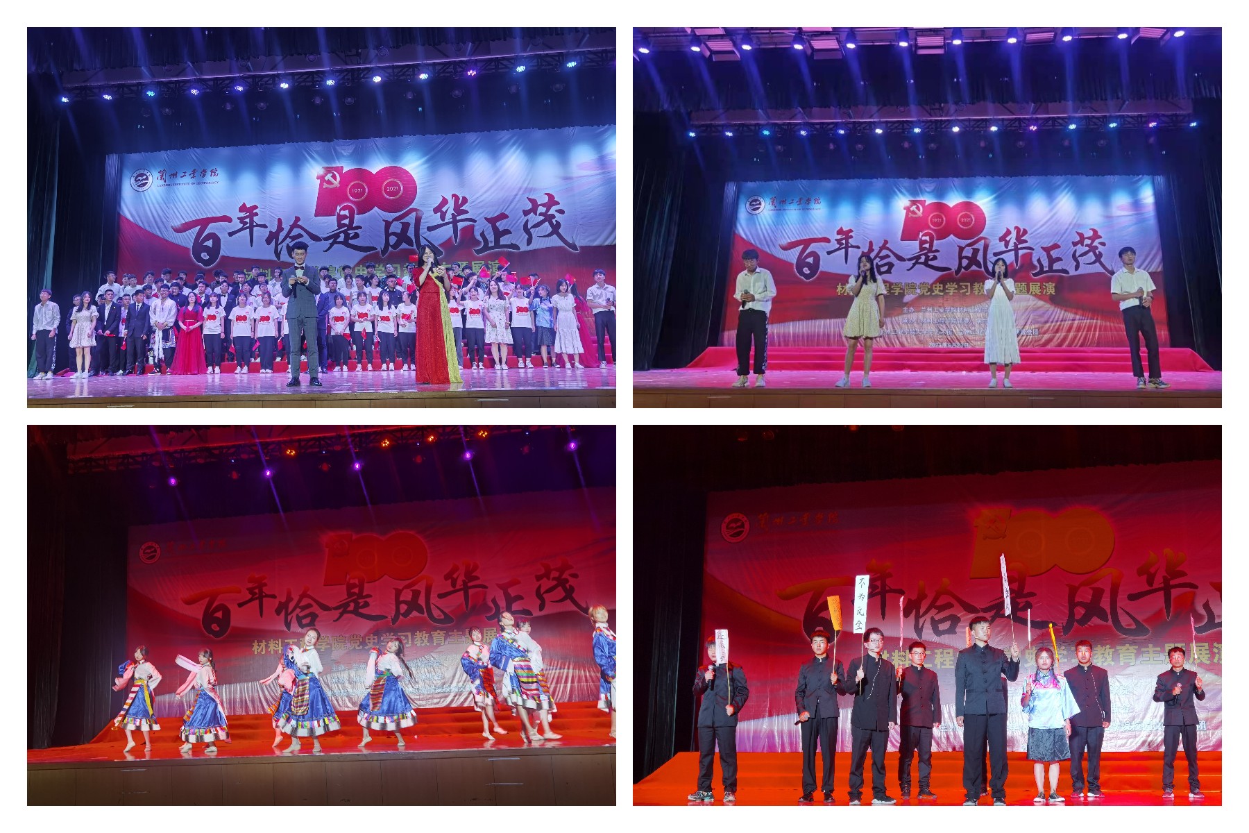 晚会在师生大合唱《不忘初心》中拉开序幕。歌舞、话剧、诗歌朗诵等丰富多彩的节目带领全场观众重温了党的光辉历程,抒发了对党和祖国的无限热爱。诗朗诵《雪落在中国的土地上》《七月的红色》《永远跟党走》再现了100年来,中国共产党领导中国人民走过的波澜壮阔而又艰难曲折的奋斗历程。情景剧《觉醒》、话剧《恰同学少年》展现了中国之志,有我千万之儿女;华夏之兴,有我青年之名。舞蹈《南城哨》、民族舞《天浴》如一群捧着洁白哈达的姑娘,伴着欢快的乐曲,踏着翩翩的舞步,喜庆中国共产党成立100周年。歌曲《高原红》《我爱你,中国》《万千星光》《我和我的祖国》用最动听的旋律歌唱祖国,歌唱伟大的中国共产党。