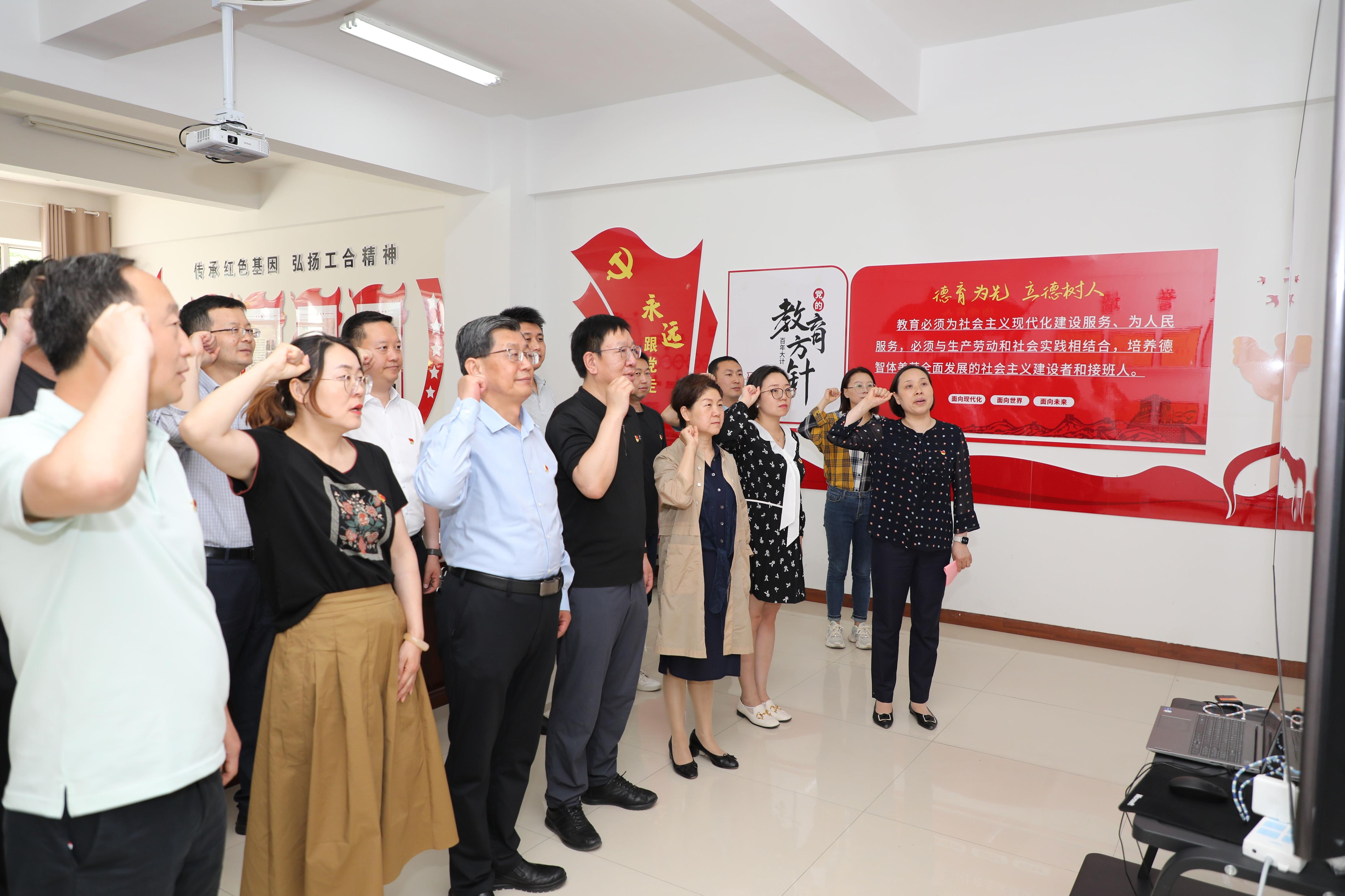 全体党员面对党旗重温了入党誓词,进一步增强党员的责任感、光荣感和使命感。在参观科技楼的过程中,雷江红一行了解了各学院产教融合、科教融合、服务社会以及大学生就业、创新创业等情况。通过观看宣传片进一步了解了学校的办学历史和薪火相传的办学精神。