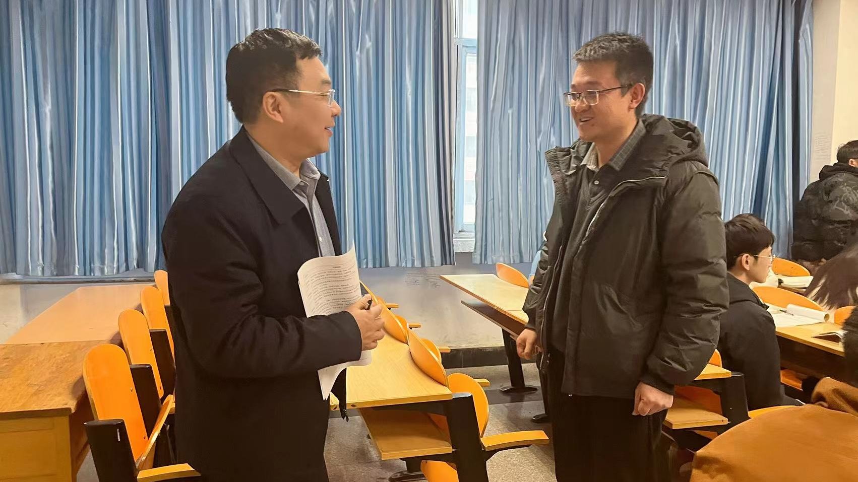 在第一教学楼四楼,刘新辉听取了马克思主义学院白鹏飞老师讲授的《毛泽东思想和中国特色社会主义理论体系概论》第一讲。课上,同学们跟着老师的授课思路,认真听讲、深入思考,积极回答提问。刘新辉坐在教室后排边听边记,课后与授课教师进行了交流。他对授课教师饱满的精神状态给予赞赏,对良好的课堂教学氛围和课堂组织形式表示肯定。鼓励教师通过加强教学设计和教学方法研究,积极开展课堂教学方式方法改革,在教学中真正做到收放自如、游刃有余。