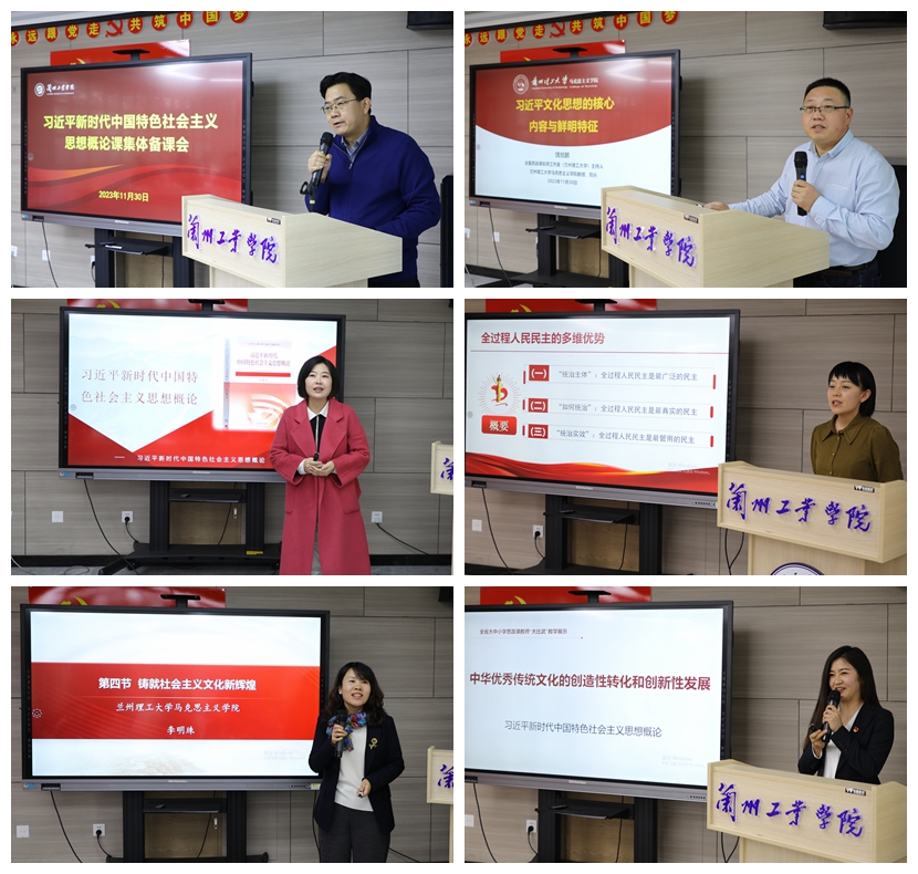 集体备课会分主旨报告、示范授课说课和交流研讨三个环节。西北师范大学马克思主义学院院长史小宁、兰州理工大学马克思主义学院院长饶旭鹏分别以“深刻把握习近平文化思想的世界观和方法论”“习近平文化思想的核心内容与鲜明特征”为题作主旨报告。在示范授课说课环节,西北师范大学姜宝莲老师、兰州理工大学李明珠老师、兰州工业学院白漫溪老师分别以“全过程人民民主的多维优势”“铸就社会主义文化新辉煌 ”“中华优秀传统文化的创造性转化和创新性发展”为主题进行了示范教学,兰州交通大学马克思主义学院刘羽薇老师进行了“习近平新时代中国特色社会主义思想概论”课示范说课。在交流研讨环节,与会教师围绕“习近平新时代中国特色社会主义思想概论”课程教学中的新思路、新方法、新路径展开积极研讨交流。