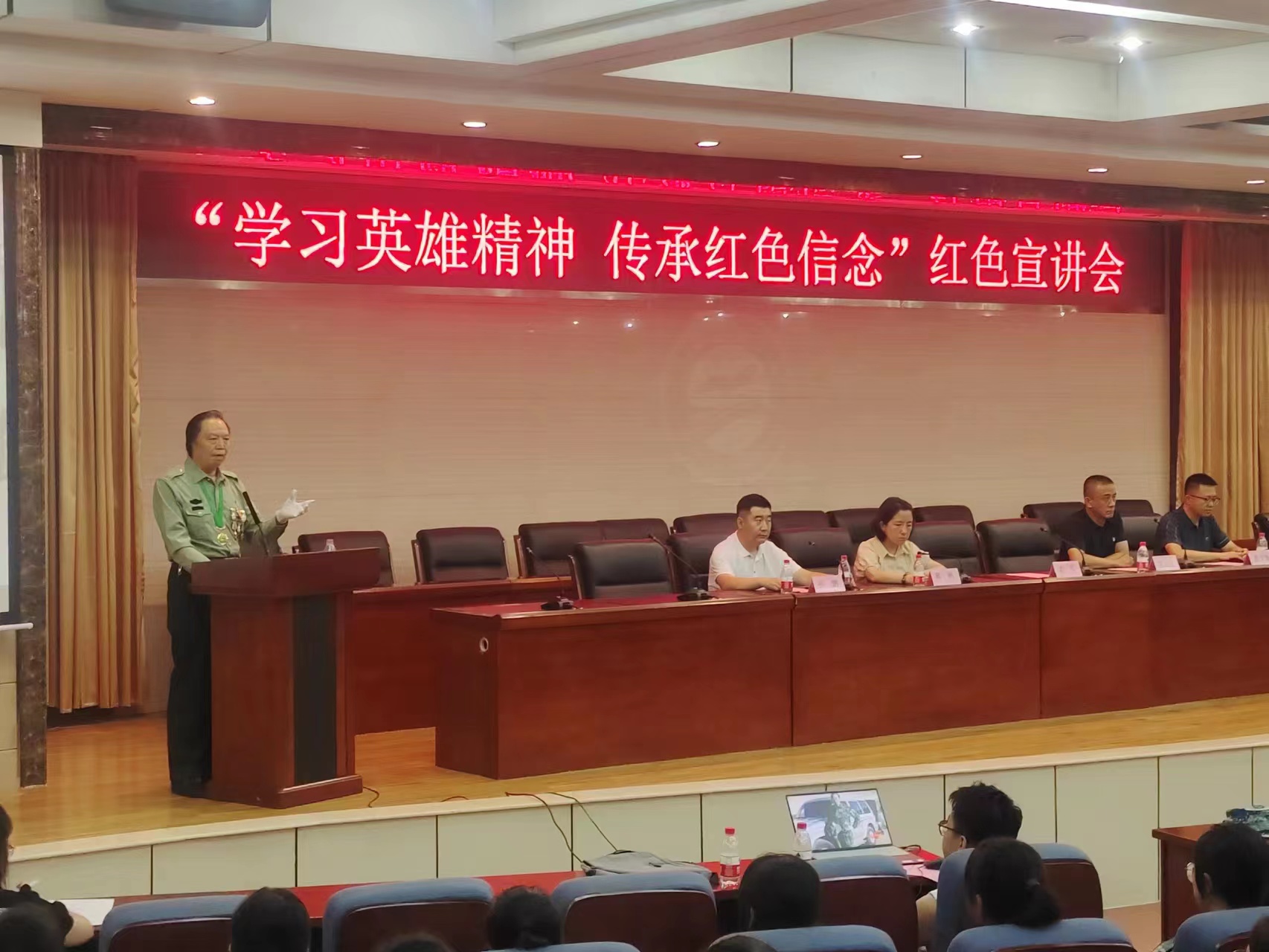 为深入学习贯彻习近平新时代中国特色社会主义思想和党的二十大精神,积极创新军事理论教育模式,7月21日,学校邀请兰州市军队离退休干部服务站举行“学习英雄精神,传承红色信念”红色宣讲。兰州市军队离退休干部服务领导、学校教师和参与军训学生共350余人参加了此次活动。