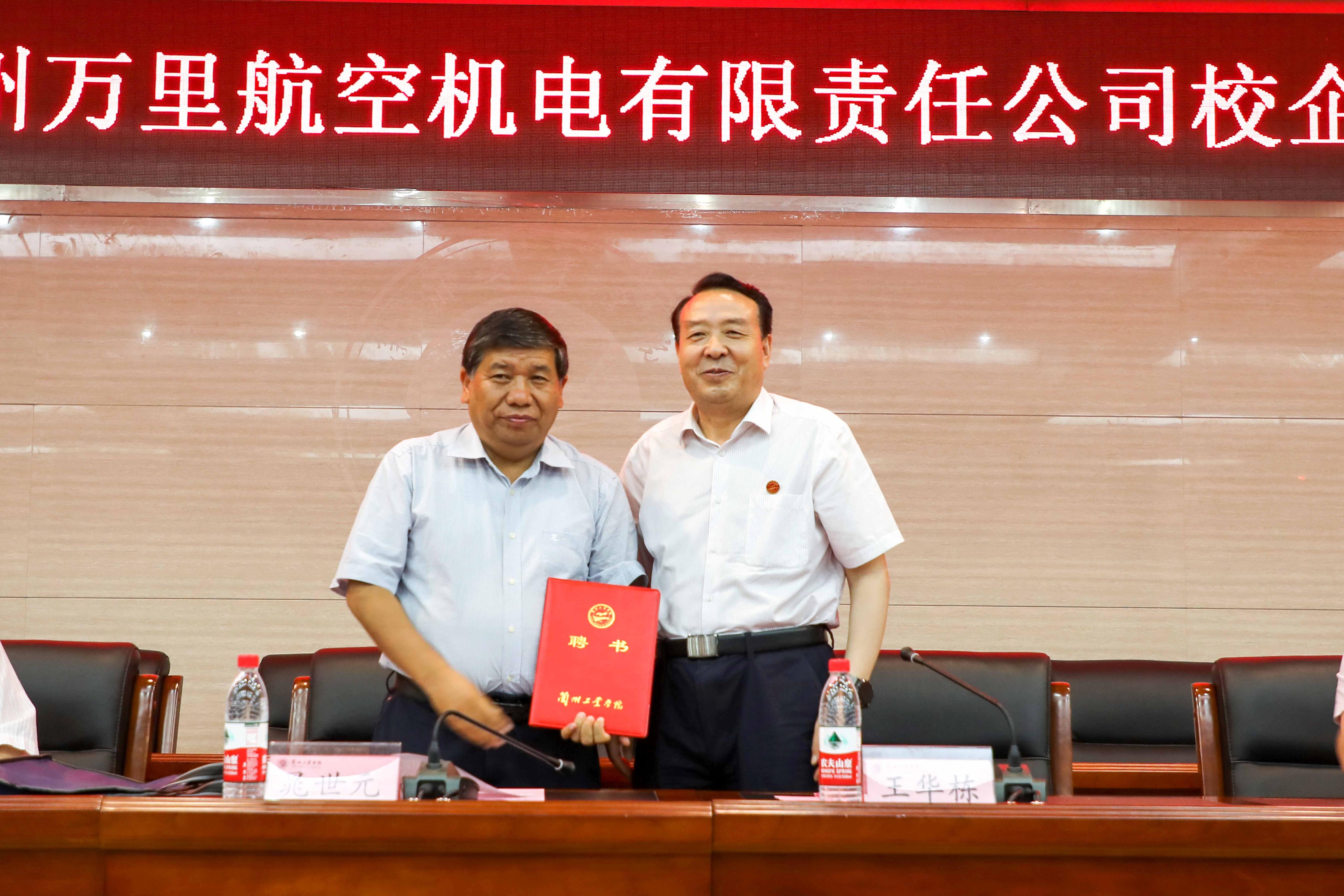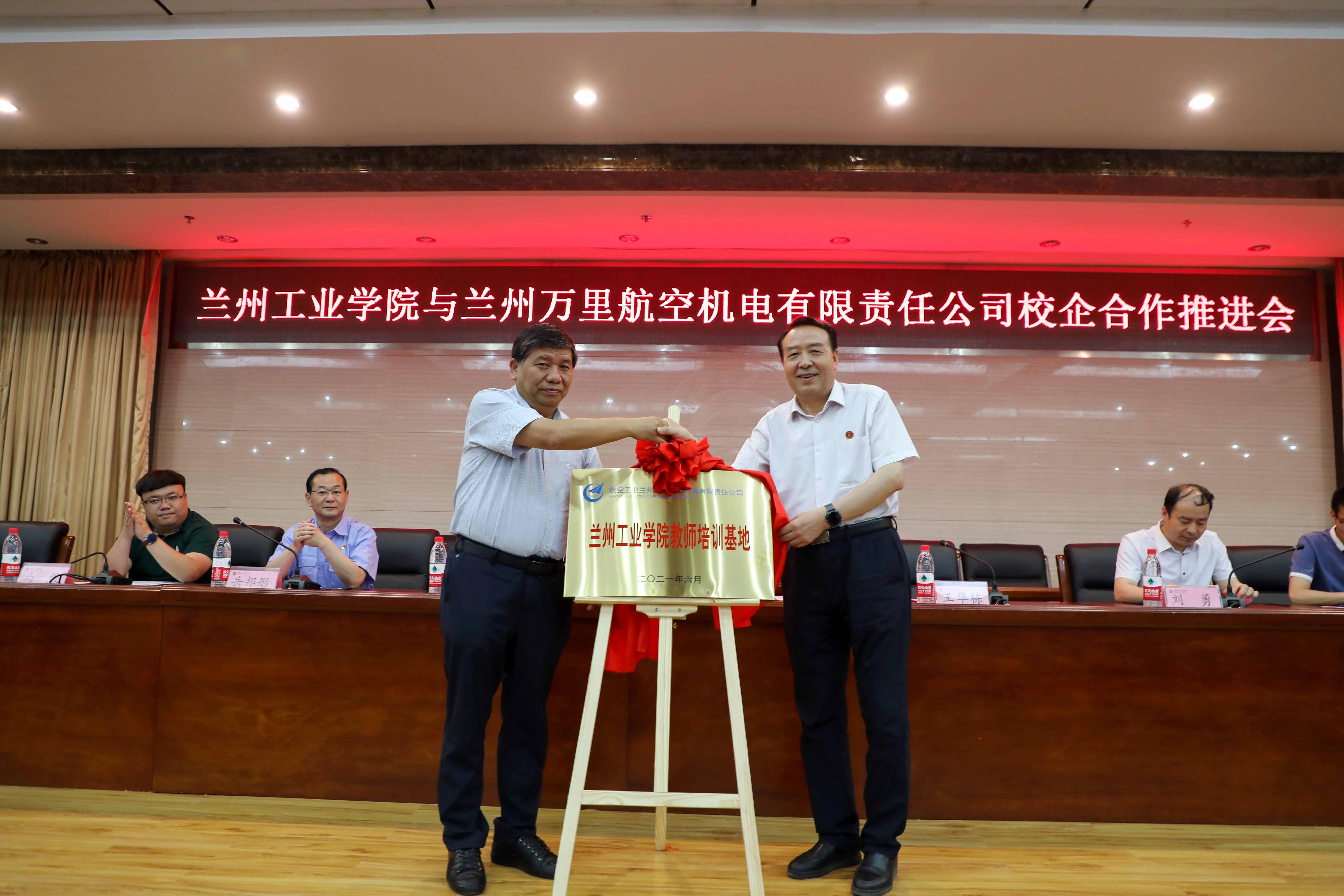 推进会上,王华栋为晁世元博士颁发了学校特聘教授聘书;晁世元、王华栋为“兰州万里航空机电有限责任公司兰州工业学院教师培训基地”揭牌;公司、学校领导为2021年“志在万里”奖学金获奖学生代表颁奖。
