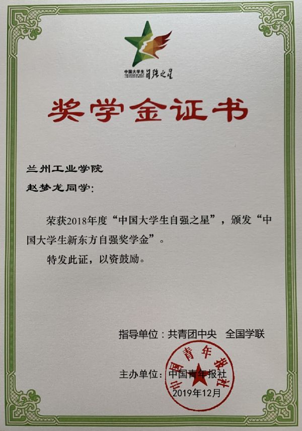 近日,由共青团中央、全国学联主办,中国青年报社承办的2018年度寻访“中国大学生自强之星”活动评选结果揭晓,我校土木工程学院2019届毕业生赵梦龙(现中铁三局集团第四工程有限公司青岛市地铁1号线瓦屋庄停车场项目部技术员)获2018年度“中国大学生自强之星”称号,同时获得“中国大学生新东方自强奖学金”。