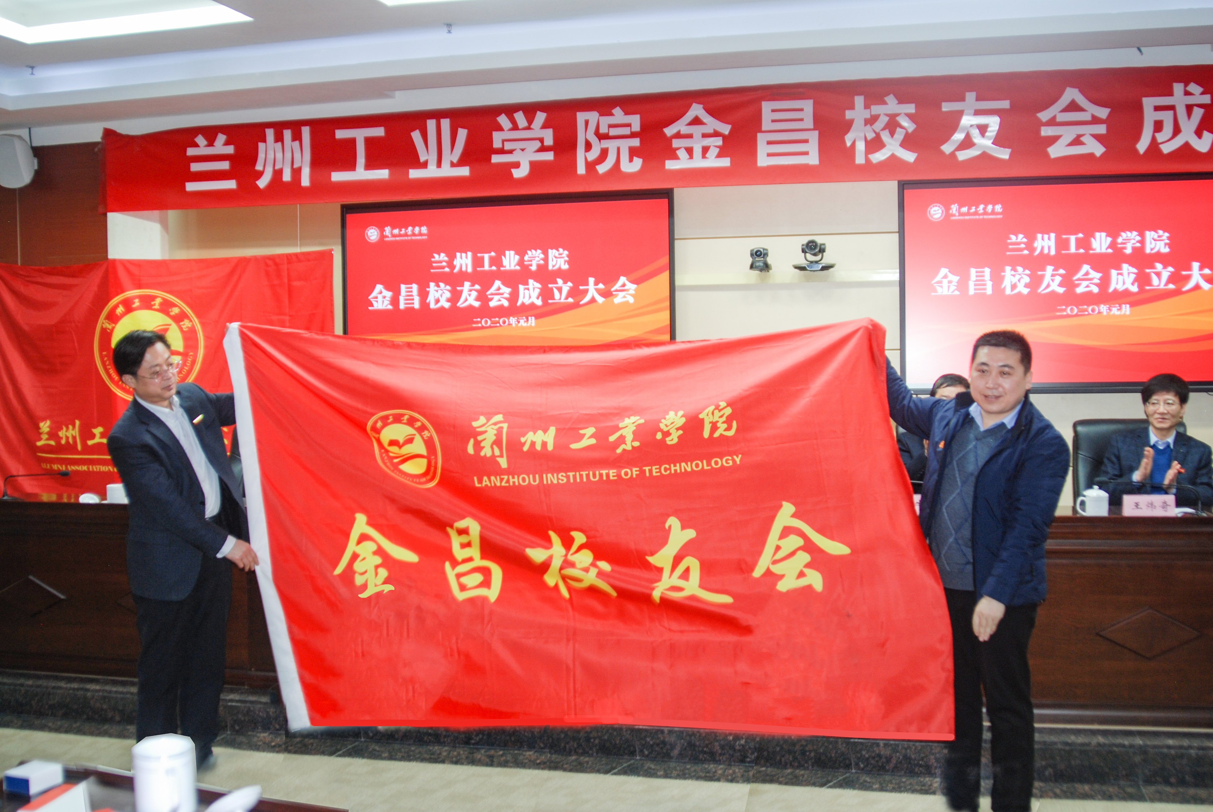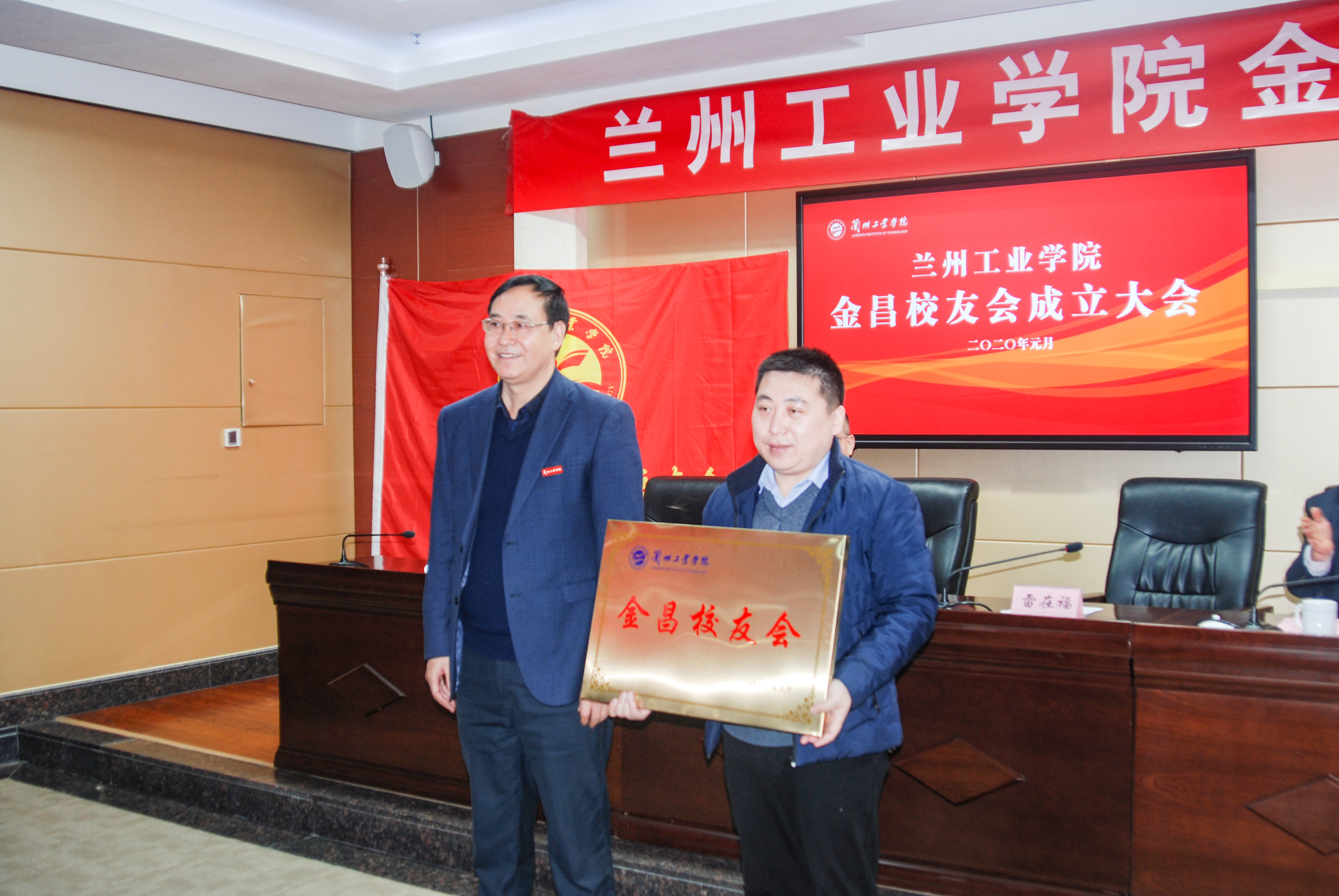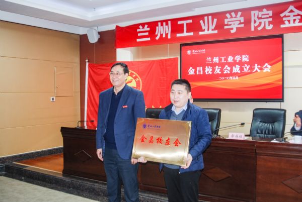黄荟铭、雷在福分别为学校金昌校友会授会旗、会牌,学校招生就业处、校友工作办公室负责人为当选的理事会成员颁发聘书。