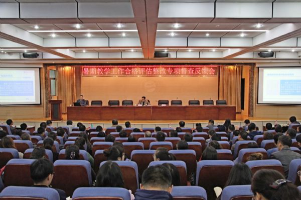 本次专项督查由学校评建督查组牵头组织校教学督导委员分3个小组对14个教学单位的教学文档材料进行集中专项督查,共抽查2018-2019学年春季学期期末课程考核文档207册、毕业设计(论文)201份,检查了本学期424位任课教师的全套教学文档(教学大纲、授课计划、教师日志、教案、讲稿),总计832份。共梳理问题1256条,其中教学文档类541条、考核类406条、毕业设计309条。为及时反馈督查组的意见和建议,促进自评整改阶段工作扎实开展,10月29日下午,廉志端主持召开本次专项督查工作反馈会。副校长李贵山出席会议。校教学督导委员,教务处、质管处班子成员,各教学单位班子成员及全体教师450余人参加了会议。