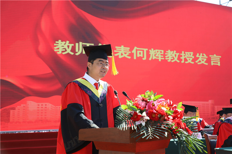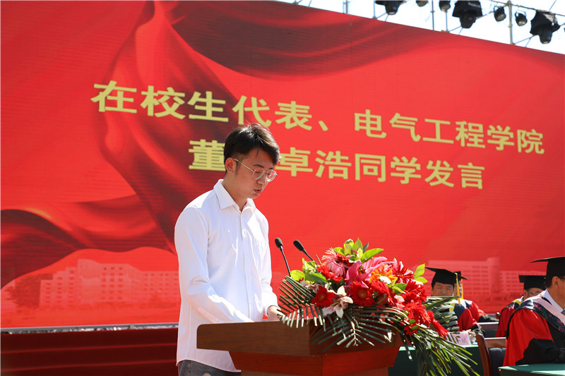 2019届本科毕业生代表、经济管理学院郭婷婷发言,她代表2019届全体毕业生表达了对母校的不舍和感激之情。在校生代表、电气工程学院董阳卓浩发言中表达了向毕业生学习,勇担使命、不负期盼的决心。教师代表何辉在发言中祝福同学们乐观自信、不断进取,在平凡的岗位上成就不平凡事业!
