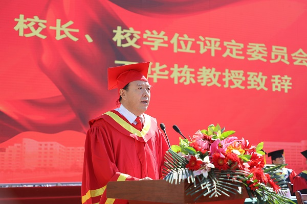 随后,王华栋发表热情洋溢的讲话。他首先代表学校向圆满完成学业的全体毕业生致以热烈的祝贺和真诚的祝福!向所有付出心血、一路辛勤培育学子们成长成才的老师们表示衷心的感谢和崇高的敬意!并与在场师生共同深情回顾了四年的大学生活。王华栋说,凡是过往,皆为序章。从今天起,大学变成了母校,同窗变成了校友,归程变成了启航。作为校长,作为师长,向同学们提几点希望:一是牢固树立远大的人生理想;二是积极发扬勤勉奋斗的精神;三是始终保持乐观向上的心态。