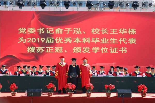 在欢快的进行曲中,俞子泓、王华栋依次为2019届优秀本科毕业生代表拨苏正冠、颁发学位证书。