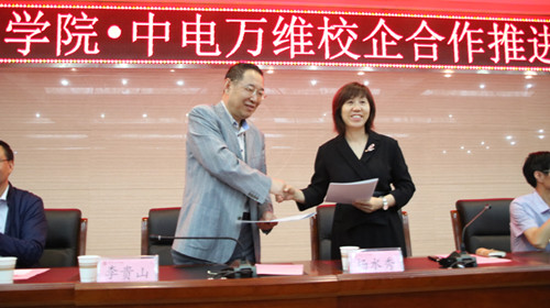 李贵山与杨水秀分别代表校企双方签订了校企合作订单人才培养协议。雷在福向中电万维七名管理及技术骨干颁发了“就业创业校外指导教师”聘书。