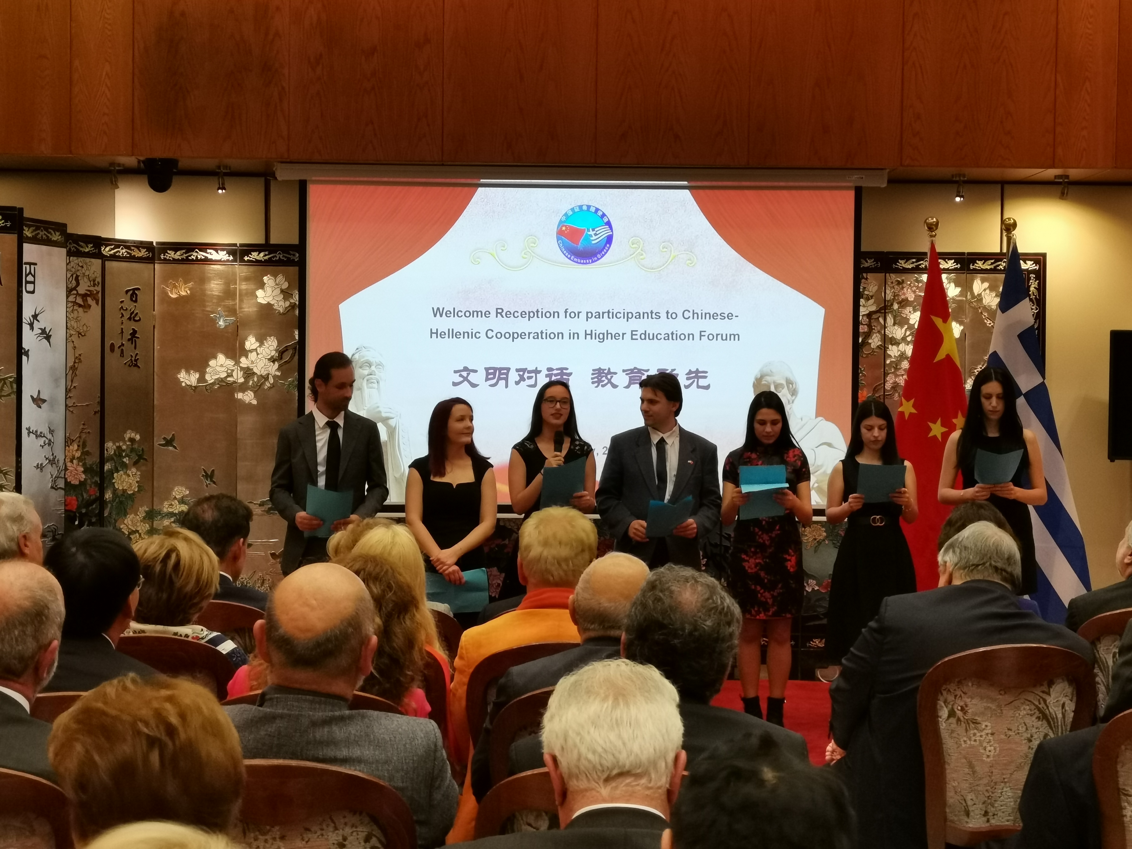 同日晚,俞子泓一行应邀参加中国驻希腊大使章启月以使馆名义举行的以“文明对话 教育为先”为主题的招待会。中国驻希腊大使章启月,希腊外交部长卡特鲁加洛斯(George Katrougalos)、国务部长弗拉姆普拉里斯(Alexandros Flambouraris),中国教育国际交流协会秘书长赵灵山,希腊国会、文化科技界、企业界名流等200余名嘉宾出席招待会。
