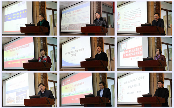 会上,赴澳大利亚参加教育部首期教务处长研修班成员马宏锋,赴清华大学参加骨干教师教学能力提升培训班代表周晶晶、程仲文,赴复旦大学参加课程思政骨干教师培训班代表张小华、张启亮,赴德国参加“面向工业4.0工科专业人才培养体系构建与创新”研修代表罗文翠、董红生,赴德国参加工业4.0工厂实验室建设研修班代表孙永吉、贾金龙分别从参训情况、主要收获和体会启示等方面作了汇报发言。在分享交流过程中,外出培训学习教师重点介绍了所在培训院校在教学管理模式、人才培养、专业建设、实习实训、课程思政等方面的经验、做法和办学特色,并结合学校实际和各自所学所教专业,提出了改革改进的思路设想和推动专业发展的措施计划。