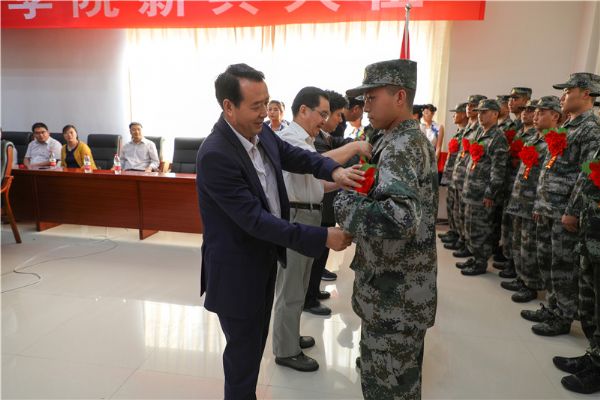 学校领导为新兵佩戴光荣花。王华栋发表了热情洋溢的讲话,他说,从今天起,你们的军旅生涯即将开始,希望你们在政治上、思想上、行动上始终与党中央保持高度一致;做到严格要求、令行禁止;发扬作风过硬,能打必胜的革命精神,努力在部队磨练自己、摔打自己,尽快适应部队生活;要刻苦训练,练就过硬的军事素质,争当新时代合格军人,使自己成为国防和军队建设的栋梁之材,为母校争光,为家乡亲人争光!