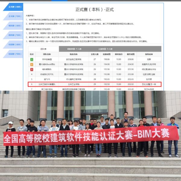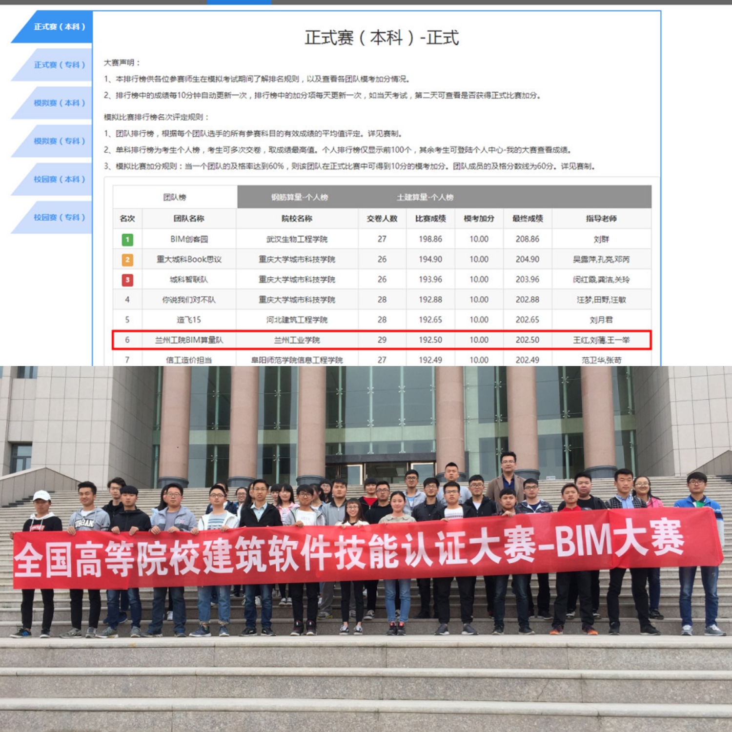 近日,在第六届全国高等院校建筑软件技能认证大赛—BIM算量大赛总决赛中,我校学子与北京交通大学、西安建筑科技大学等192所本科院校257支团队9000余名学生进行了激烈角逐,最终,由我校土木工程学院教师王红、刘蒨、王一举等指导,土木工程学院工程造价专业、土木工程专业的29位学生组成的代表队喜获本科组团体一等奖(全国本科组第6位、甘肃参赛本科组第1位),台树文、马永飞、宋涛分获本科组甘肃省钢筋算量个人前三名、韩淤淑、李鹏艳、郑磊分获甘肃省土建算量个人前三名。这是继去年第五届全国高等院校建筑软件技能认证大赛—BIM5D大赛之后,在钢筋算量和土建算量大赛上取得的又一好成绩。 全国高等院校建筑软件技能认证大赛—BIM算量大赛是我国高等教育领域工程造价与工程管理专业规模最大、业界影响力强的大赛之一。