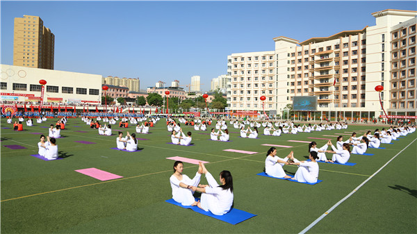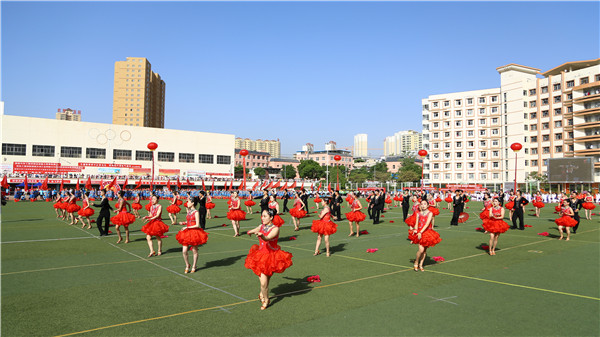 随后拉丁舞选项班及协会组成的表演团激情、奔放、动感的拉丁舞表演《那些年我们一起唱过的情歌》拉开了运动会开幕式表演的序幕。瑜伽选项课的150名学生和瑜伽俱乐部的20名教师带来的瑜伽表演《云水禅心》,让大家见证和领略了瑜伽的健康和谐、完美统一。480名健美操选项课的女同学带来的团体操表演《起航》,为本次运动会呈现了一场视觉盛宴。国旗护卫队好男儿带来的《青春筑梦战旗红》,斗志昂扬,气势如虹,展出洒脱身姿,武出国护风采。由吕雪婷、田超两位教师领唱,大学生合唱团和大学生艺术团舞蹈队的同学们展示了别具风格的《青春中国梦飞扬》大型歌舞表演……精彩的开幕式表演赢得了阵阵喝彩。