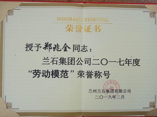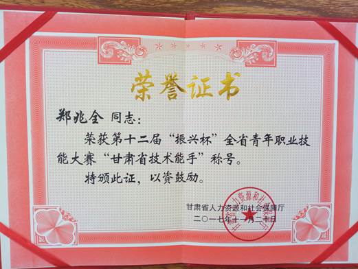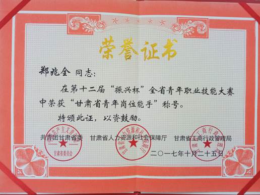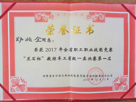 2017年以来,郑兆全先后和同事完成CAK系列、QB系列共计465套军品的加工工作。无论严寒酷暑,无论雨雪肆虐,他总是早来晚归,兢兢业业,忘我地忙碌在生产一线,把工作看得高于一切,遇到紧急加工项目,他就主动加班,从无怨言,为公司生产倾心奉献。2017年,他先后获得甘肃省第十二届“振兴杯”暨全省青年职业技能大赛数控车工比赛第一名、甘肃省职工职业技能竞赛“兰石杯”数控车工省级一类决赛第一名,被授予甘肃省“青年岗位能手”和“技术能手”荣誉称号。