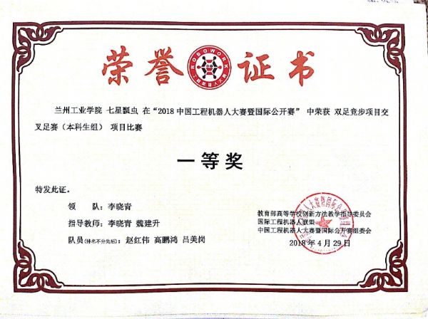 4月25-29日,由教育部高等学校创新方法教学指导委员会等单位联合举办的2018中国工程机器人大赛暨国际公开赛在中国地质大学举行。我校电气工程学院4支队伍参加比赛。其中赵红伟、高鹏程、吕美刚(指导教师:李晓青、魏建升)获一等奖,其他3支队伍分获二等奖。 大赛包含机器人工程创新设计、人工智能、机器人搬运、机器人竞速、机器人竞技等18大项,来自29个省市自治区355个单位的1858支代表队参赛,其中参赛教师2591人,参赛学生5186人。共评出一等奖279个,二等奖372个,三等奖465个。比赛项目、参赛学校、队伍数量及参赛师生总数均创历史新高。