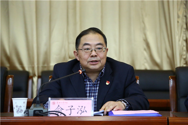党委书记俞子泓作了《提高政治站位 强化责任担当 坚定不移推动全面从严治党向纵深发展》的主旨讲话。他指出,召开这次会议的主要任务是:以习近平新时代中国特色社会主义思想为指导,全面贯彻党的十九大、十九届中央纪委二次全会和省纪委二次全会精神,认真落实教育部2018年教育系统全面从严治党工作视频会议精神,分析研判学校全面从严治党形势,安排部署全面从严治党工作,增强“四个意识”,坚定“四个自信”,进一步推动全面从严治党向纵深发展,为助推学校全面转型、提升办学水平提供坚强保证和强大动力。