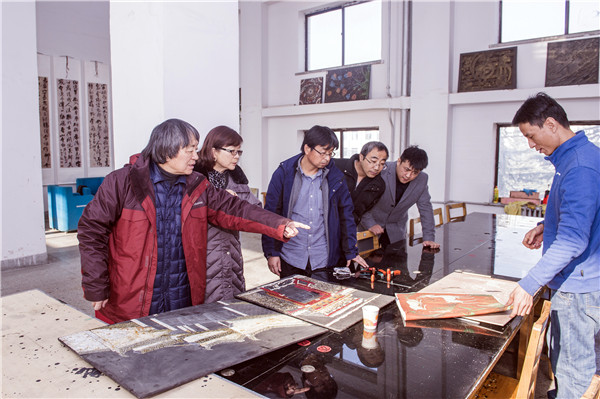 孙焱一行参观了艺术设计学院摄影实验室、设计专业教室、书画装裱室、教职工书画展以及艺术设计学院新筹建的“漆画漆艺与文创产品研发中心”,详细了解漆画漆艺材料与制作工艺。
