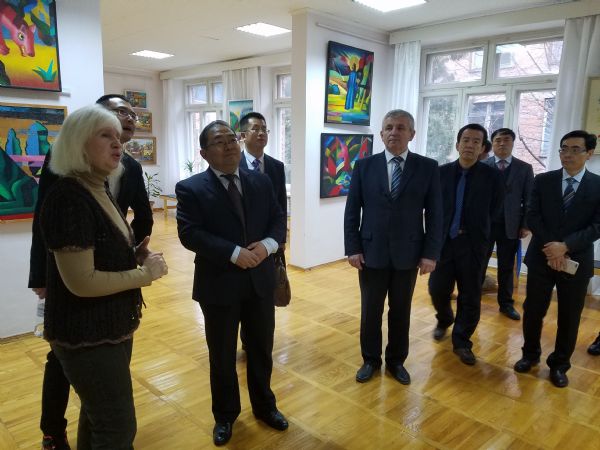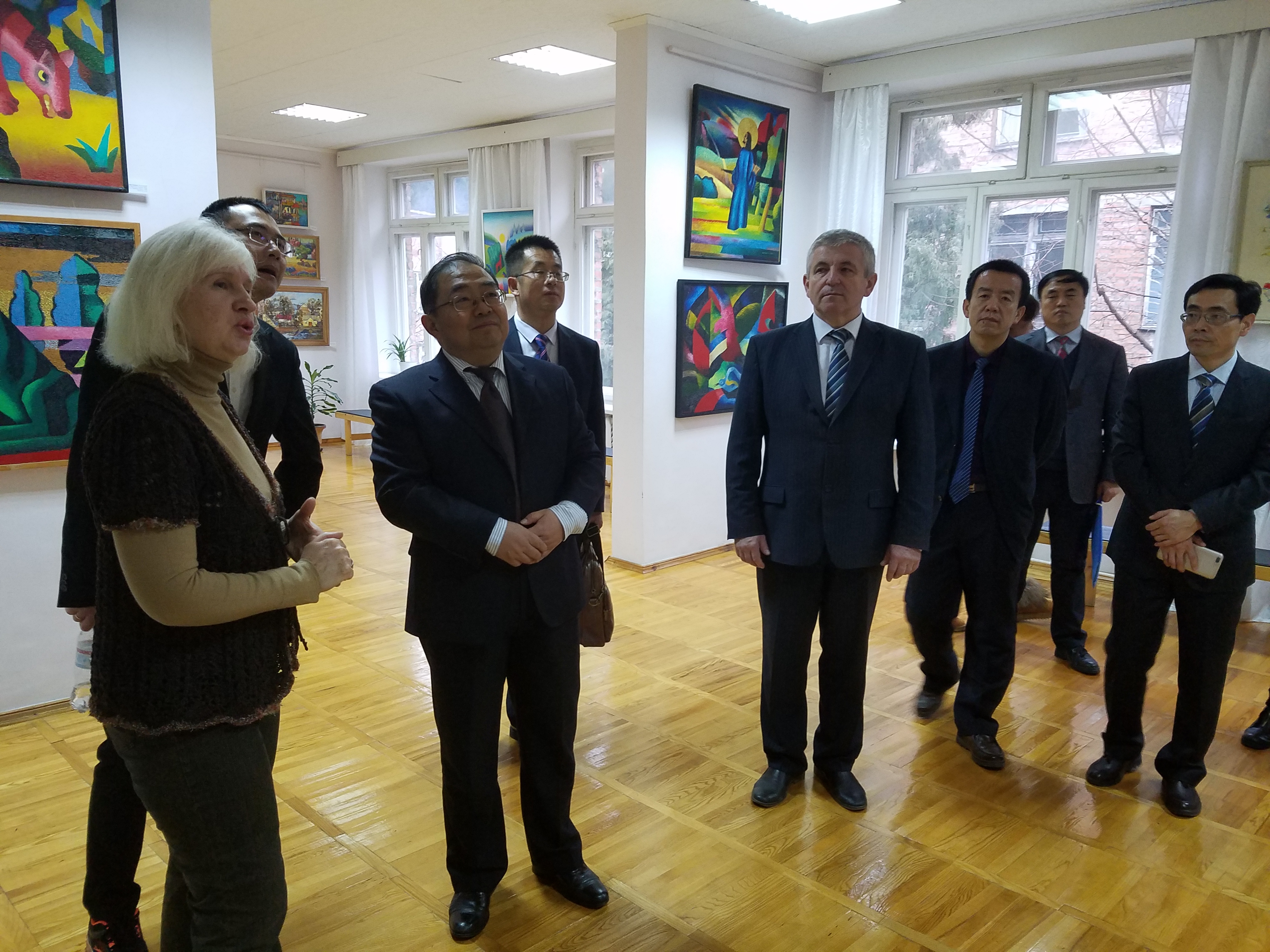 在乌克兰文尼察国立技术大学访问期间,俞子泓一行在该校校长会议室会见了该校校长Volodymyr V. GRABKO教授、副校长Viktor Mizemyy教授和国际关系中心主任Mykola Pradivlianny教授,双方就学生留学、教师访学、文化交流、校际联络与高层互访等方面合作达成共识,签署了《兰州工业学院与文尼察国立技术大学合作备忘录》,随后参观了该校大学生艺术中心。