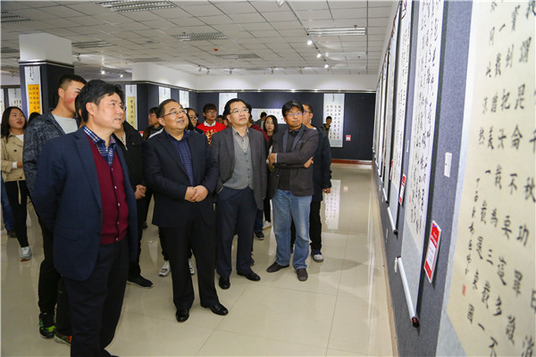 10月17日,由校工会、校团委、艺术设计学院主办,职工书画协会、劲草书画协会承办的“喜迎党的十九大”师生书画展在图书馆展厅开展。校领导俞子泓、魏军、廉志端,总会计师王多兴,校长助理雷在福及200多名学生参加开幕式。