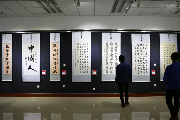 此次书画展共展出作品80余幅,作品紧紧围绕“喜迎十九大、不忘初心、继续前进”的主题,以习近平总书记用典、讲话等为主要内容。其中书法作品50幅,绘画、摄影作品30余幅。作品既有龙飞凤舞、气象万千的书法作品,又有浓墨重彩、栩栩如生的绘画作品;既有书画爱好者的墨宝,又有学生的新书力作。参展作品中书法作品有楷、行、草等书体,绘画作品以国画、油画为主。部分摄影作品。参展作品展现了作者的匠心独运,用不同艺术语言歌颂伟大的党、伟大的祖国和美丽的校园,给广大师生带来了一场视觉盛宴和文化大餐。
