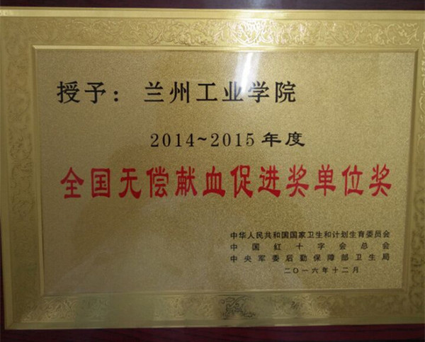 《中华人民共和国献血法》施行以来,在各级政府的领导下,社会各界大力践行社会主义核心价值观,弘扬献血救人的无私奉献精神,各地涌现出了一大批先进个人、单位和部队。为表彰先进,鼓励社会、公民关心、支持、参与无偿献血工作,根据《中华人民共和国献血法》和《全国无偿献血表彰奖励办法(2014年修订)》的规定,经地方有关部门推荐,并按照相关规定向社会进行了公示,由国家卫生计生委、中国红十字会总会、中央军委后勤保障部卫生局,国卫医发【2016】73号文件,于2016年12月27日,授予我校“无偿献血促进奖”殊荣!