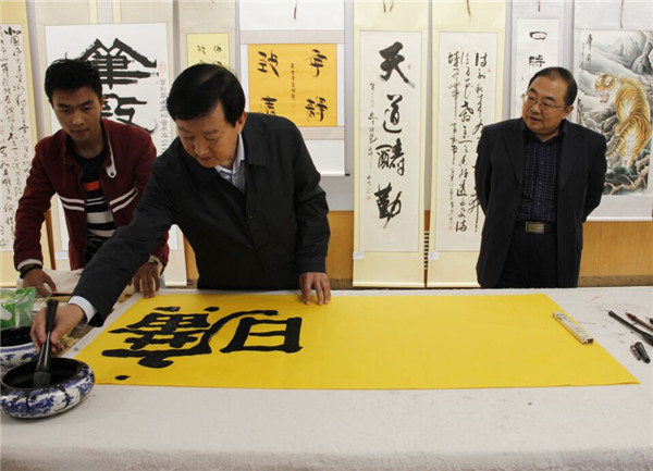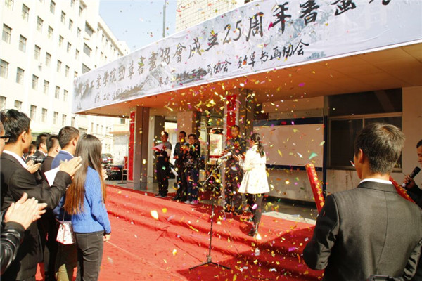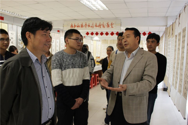 10月18日下午,由校工会、团委、图书馆主办,教职工书画协会、劲草书画协会承办的劲草书画协会成立25周年书画展活动在大学生活动中心二楼展厅拉开帷幕。中国青年书法家协会会员、甘肃书画家协会理事张弘,著名书法家马维,中国书画院兰州分院副院长蒋鹏瑛,部分高校书法协会代表队以及200余名学生参加了开幕式。 党委书记高永新,校长王华栋,党委副书记、副校长俞子泓,总会计师王多兴,校长助理雷在福等领导莅临现场观摩指导。高永新现场挥毫泼墨,并为在场同学们深入浅出的阐释书法创作的要领和鉴赏方法。王华栋在讲话中对劲草书画协会25周年书画展的工作给予了高度评价。 此次书画展共征集到包含全国书画名家及我校师生创作作品120余幅,作品主题突出,立意新颖,风格多样,格调高雅,艺术特色鲜明。