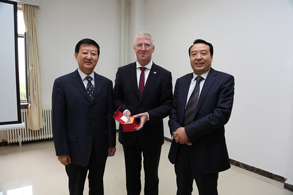 党委书记高永新、校长王华栋为鲁迪博士赠送学校纪念品