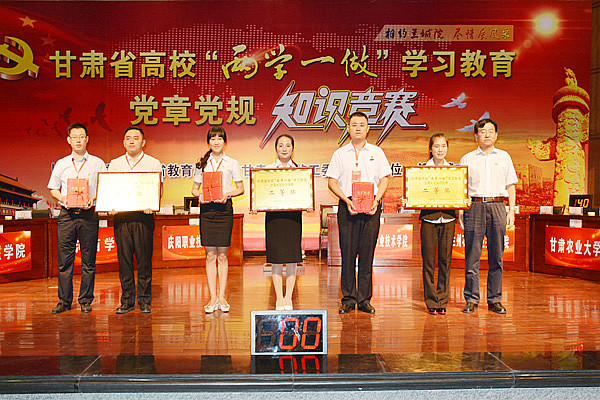 此次竞赛是全省高校“两学一做”学习教育和纪念建党95周年的系列活动之一,共有来自全省42所高校的师生代表队参赛。竞赛以党章、中国共产党廉洁自律准则、中国共产党纪律处分条例和习近平总书记系列讲话、“两学一做”学习教育内容为主,分为必答和抢答两个环节。最终,兰州城市学院代表队及庆阳职业技术学院代表队获得一等奖,兰州工业学院代表队、西北师范大学代表队、甘肃医学院代表队获二等奖,兰州财经大学陇桥学院代表队、甘肃农业大学代表队、兰州石化职业技术学院代表队、白银矿冶职业技术学院代表队、河西学院代表队获三等奖。(供稿、摄影/学校“两学一做”学习教育协调推进领导小组办公室)