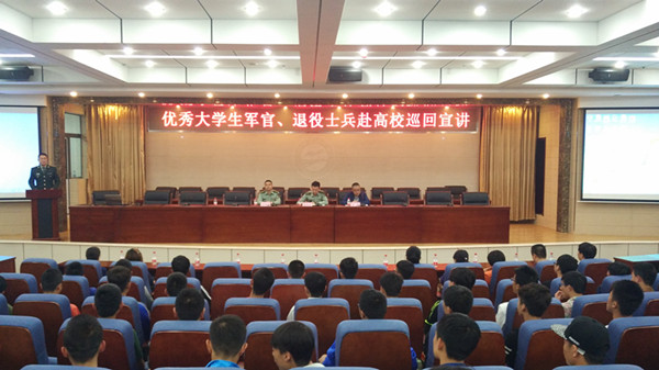 为贯彻落实2016年全国大学生征兵工作视频会议精神,做好我校大学生应征入伍工作,5月27日晚,学校在图书馆报告厅开展 “优秀大学生军官、退役士兵赴高校巡回宣讲”活动。甘肃省军区司令部参谋张炳炎、兰州市七里河区武装部政委赵增国等出席活动, 280余名师生参加了活动。