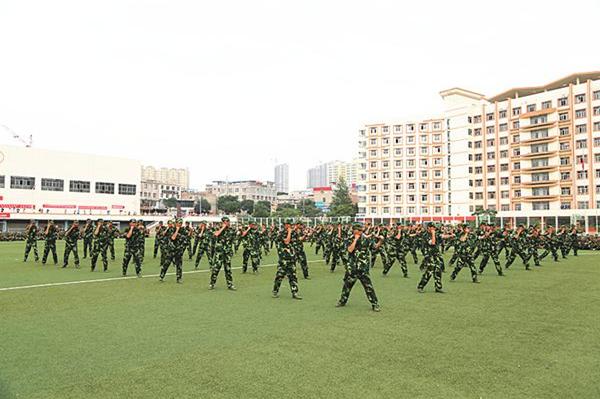 上午9时,校长王华栋在军训团副团长、解放军96376部队侯磊上尉的陪同下检阅军训方阵。随后进行了分列式表演。在队列、军体拳、女子健身操汇报表演过程中,参训学生们以饱满的精神、嘹亮的口号和端正的军姿展现了军训取得的成绩。