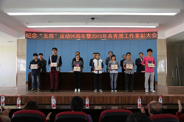 与会领导为获奖代表颁奖。颁奖仪式后,优秀教工团干代表郭晶晶、优秀共青团员标兵李菊娟分别代表受表彰的教师和学生发言。