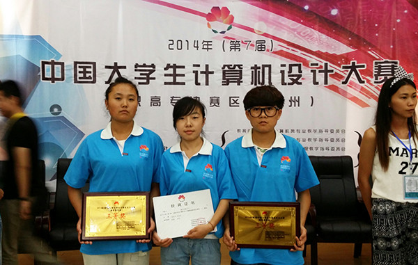 8月14日至17日,由教育部高等学校计算机科学与技术教学指导委员会、教育部高等学校计算机基础课程教学指导委员会、教育部高等学校文科计算机基础教学指导委员会和教育部高等学校高职高专计算机类专业教学指导委员会联合主办的“2014年中国大学生计算机设计大赛”高职高专组总决赛在郑州举行,共有来自来全国50多所高校180多支代表队参赛。我校软件工程学院学生康佳制作的DV影片《生命的独白》(指导教师:辛欢),张胜华、田玲凤制作的交互媒体杂志《康巴民族文化》(指导教师:陆娜)获数媒设计专业组三等奖。 (供稿、摄影/软件工程学院)