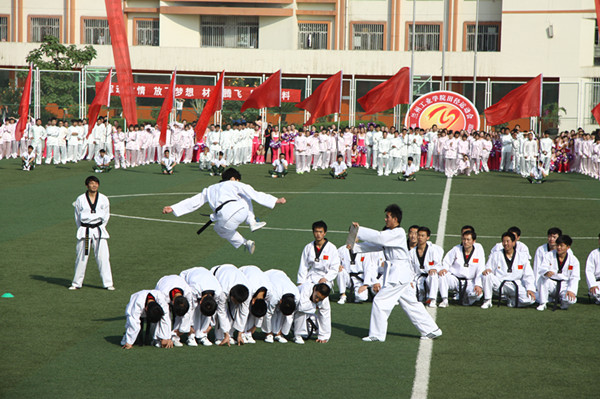 随后进行的多姿多彩的团体操表演将开幕式推向高潮。拉丁舞选项班及协会组成的表演团激情、奔放、动感的拉丁舞表演《舞动生命》获得了阵阵喝彩。跆拳道代表队展示了“腿的艺术”,踢靶、过七人飞踢、连续难度技术击破、腾空前踢技术击破等高难度动作引来现场观众一致叫好。近两百名同学组成的团体表演了“八段锦”,招式自然舒缓,动作柔和优美,仿佛华丽的锦缎在微风中随性而动、起伏飘逸。短兵团队表演的集体技术、双人配合技术、对抗展示等充分展示了短兵剑客们“武礼”之魅力。健美操团队把时代的节奏,青春的节拍巧妙地融合在一起,通过各种队形的变换展示了运动的旋律、青春的活力。