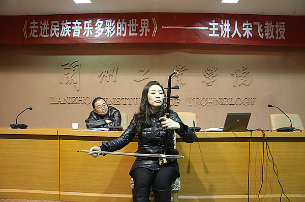 2012年11月14日晚,著名二胡演奏家、中国音协二胡协会会长、中国音乐家协会副主席、中国音乐学院副院长宋飞教授应邀在我院八楼学术报告厅举办了《走进民族音乐多彩的世界》讲座。副院长俞子泓出席并主持讲座。 宋飞教授围绕音乐的起源、作用、特征以及如何能够走进中国丰富多彩的民族音乐等内容进行了精彩讲授。期间,宋教授或亲自演奏示范、或播放音乐视频、或幽默风趣地模仿方言进行讲述,让师生们领略了音乐艺术的魅力。 俞子泓对宋飞教授来我校讲学表示衷心感谢。他说,工科类学校缺失的正是音乐艺术等人文素质的熏陶与培养,宋教授的精彩讲授,将积极推进我校人文素质的培养及校园文化建设工作。(供稿 团委/ 摄影 宣传部)