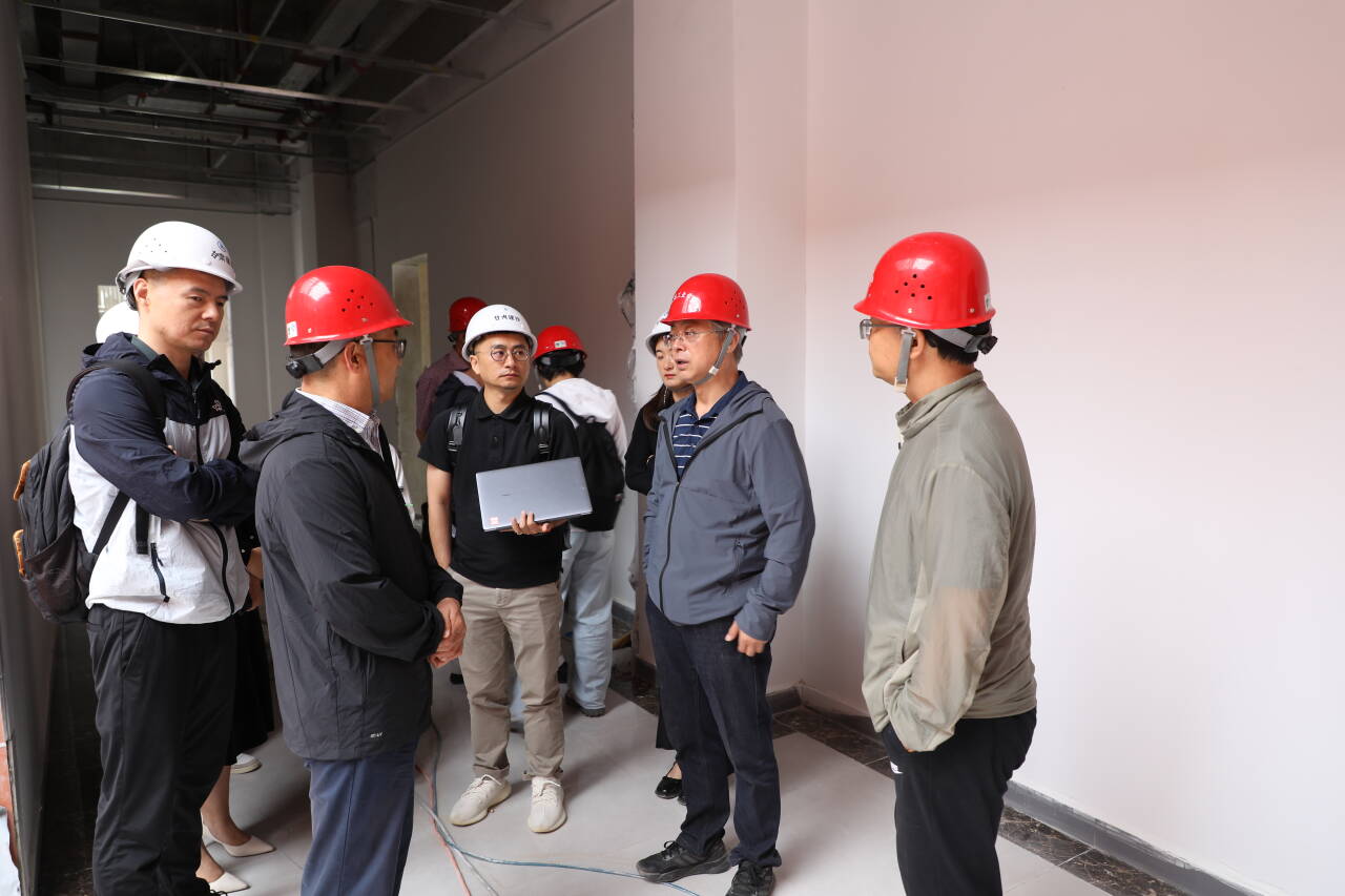 黄荟铭一行深入建设工地,先后来到行政楼、学生生活服务综合体等项目建设现场,重点考察了校史馆内部构造、办公楼连廊等地,并围绕校史馆的功能需求对相关问题提出了指导意见和具体要求。