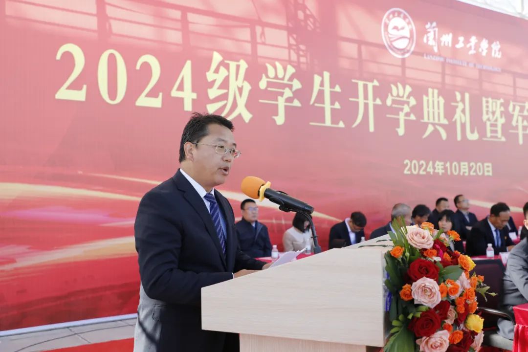 刘新辉以“云程发轫,彩练飞舞”为题,以“红色、金色、绿色、紫色”四种颜色对同学们提出了希望。一是希望同学们赓续“红色”血脉,让青春点燃爱党爱国的火焰。从烽火硝烟到和平年代,红色血脉与工业基因始终在兰工院的校园里赓续相传。时代赋予了大家实现中华民族伟大复兴的崇高使命,要继承先辈遗志,赓续红色血脉,像历届工院学子一样,坚定理想信念,坚守报国初心,厚植爱国爱党情怀。二是希望同学们珍惜“金色”年华,让青春绽放奋斗的光芒。在学校喜迁新址之际,同学们要更加珍惜优越的学习环境,紧抓当前的黄金时期,把学习作为第一要务,胸怀强国之志,锤炼强国之技,勇建强国之功,在服务国家奉献社会中成就更有价值的人生。三是希望同学们播撒“绿色”种子,让青春释放创新的能量。同学们要积极参加各类科技竞赛和创新创业活动,将科学精神和工匠精神有机结合,努力铸就新时代科魂匠心,求真务实、勇于探索。四是希望同学们的大学生活姹紫嫣红,让青春放飞自由的梦想。同学们虽然身处工科院校,但依然可以拥有“紫色”的浪漫,从中华优秀传统文化中努力汲取积极向上的精神力量,增强文化自信,把握历史主动,做中华优秀传统文化的忠实传承者和弘扬者,涵养进取品格,绽放青春之花!