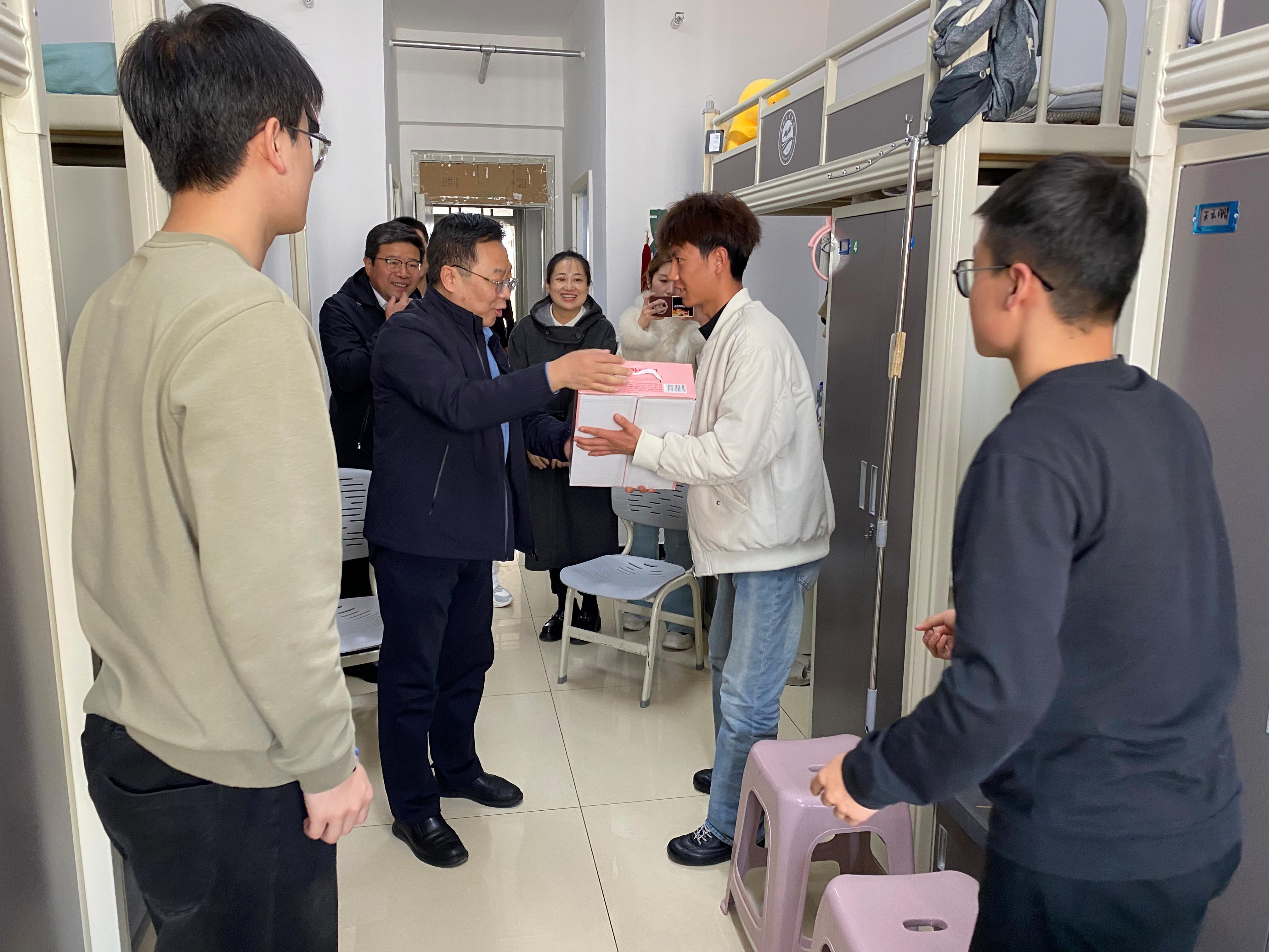 元宵佳节暖意浓,心系学子送温情。3月3日,正值丙午马年元宵佳节,学校党委副书记、校长刘新辉,副校长贾杰华深入机电工程学院、电气工程学院、电子信息工程学院学生宿舍,开展元宵节走访慰问活动,为同学们送上节日慰问品与真挚的元宵祝福。