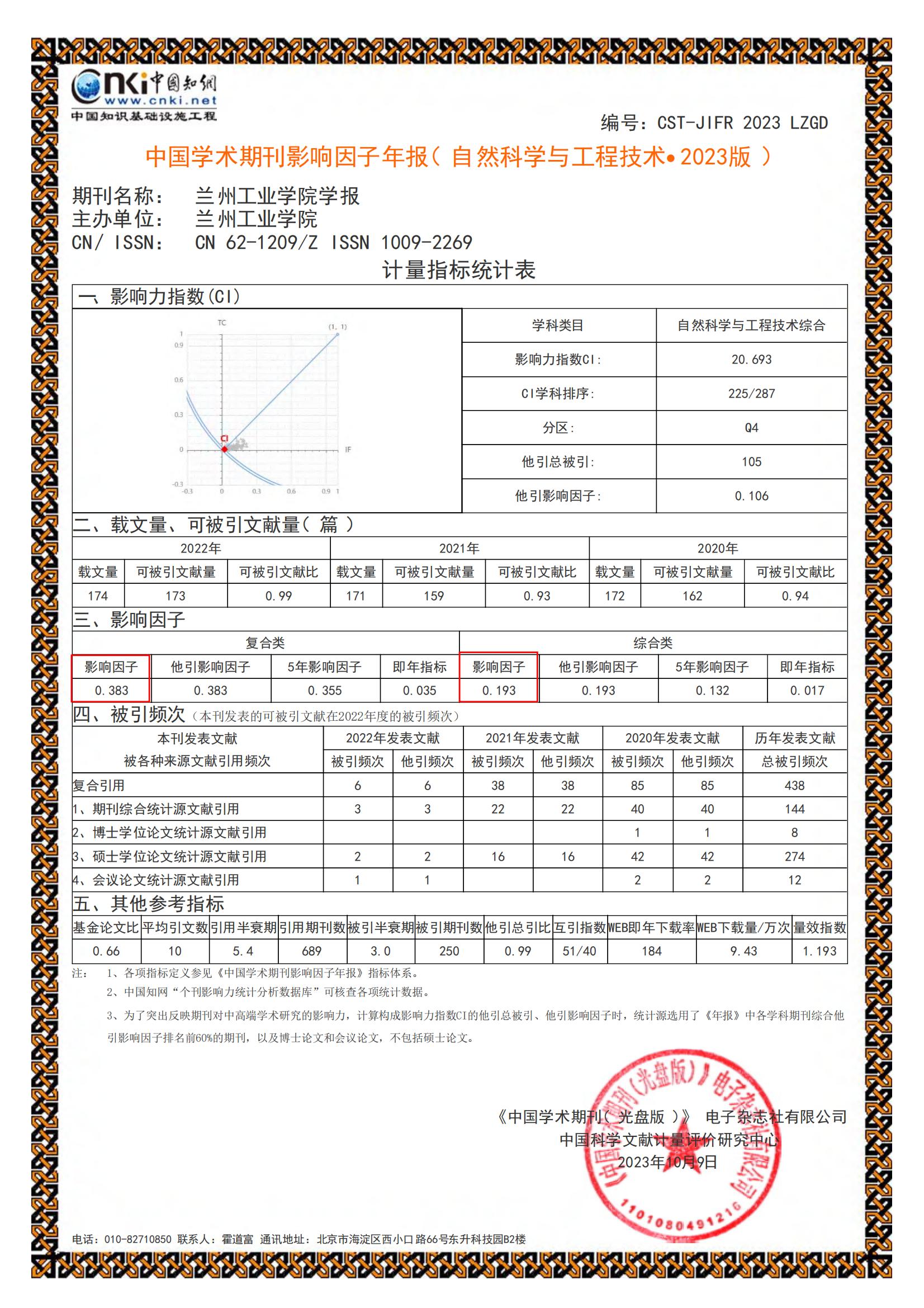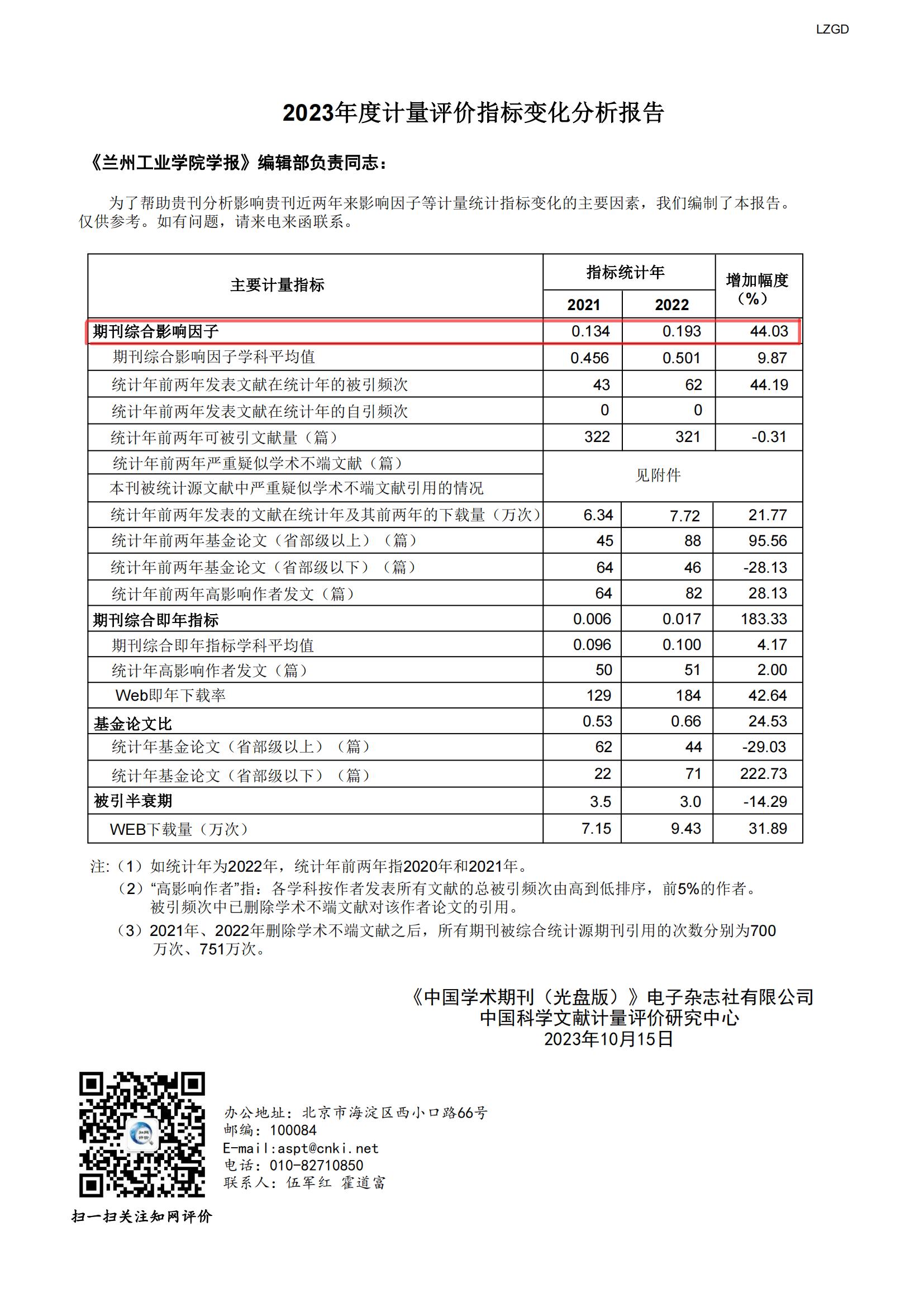 近日,《中国学术期刊(光盘版)》电子杂志社有限公司与中国科学文献计量评价研究中心联合发布《中国学术期刊影响因子年报(自然科学与工程技术)》(2023版)及《2023年度计量评价指标变化分析报告》显示,《兰州工业学院学报》(以下简称《学报》)影响力各项指标继续提升。2023版《学报》的复合影响因子为0.383,相较2022版的0.36,增幅为6.4%;综合影响因子为0.193,相较2022版的0.134,增幅达44.03%,实现影响因子和影响力大幅度提升。顺利通过甘肃省委宣传部的评价考核,充分体现了省委宣传部、评价机构和学界对《学报》办刊质量的高度认可。