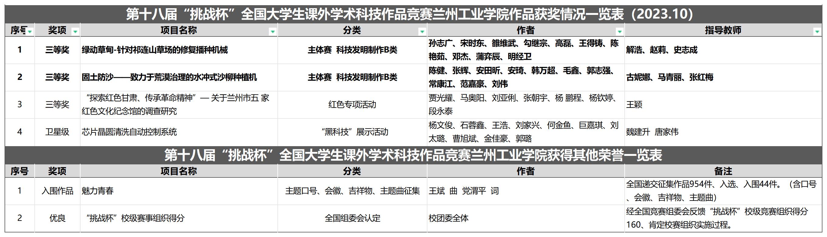 10月30日,由共青团中央、中国科协、教育部、中国社会科学院、全国学联、贵州省政府共同主办的第十八届“挑战杯”全国大学生课外学术科技作品竞赛终审决赛在贵州大学落下帷幕。经过激烈角逐,我校在主体赛道获国家级三等奖2项、红色专项活动获国家级三等奖1项,“黑科技”展示活动获卫星级作品1项。其中,《绿动草甸-针对祁连山草场的修复播种机械》(负责学生:孙志广、宋时东、雒维武、勾继宗、高磊、王得铸、陈艳茹、邓杰、蒲弈辰、明经卫,指导教师:解浩、赵莉、史志成),《固土防沙——致力于荒漠治理的水冲式沙柳种植机》(负责学生:陈健、张辉、安田昕、安琦、韩万超、毛鑫、郭志强、常康江、范嘉豪、刘伟,指导教师:古妮娜、马青丽、张红梅)分获主体赛三等奖;《“探索红色甘肃,传承革命精神”— 关于兰州市五家红色文化纪念馆的调查研究》(负责学生:贾光耀、马奥阳、刘亚俐、张朝宇、杨鹏程、杨钦婷、段永泰等,指导教师:王颖)荣获红色专项活动三等奖;《芯片晶圆清洗自动控制系统》(负责学生:杨文俊、石蓉鑫、王浩、刘家兴、何金鱼、巨嘉琪、刘太璐、曹旭斌、金佳豪、郭璐,指导教师:魏建升、唐家伟)获“黑科技”展示活动卫星级作品。学校入围“挑战杯”国赛竞赛作品数量创历史新高,红色专项活动、“黑科技”展示活动首次实现入围、入选国赛的历史性突破。校级“挑战杯”赛事组织经全国组委会认定反馈得分160,评估优良。