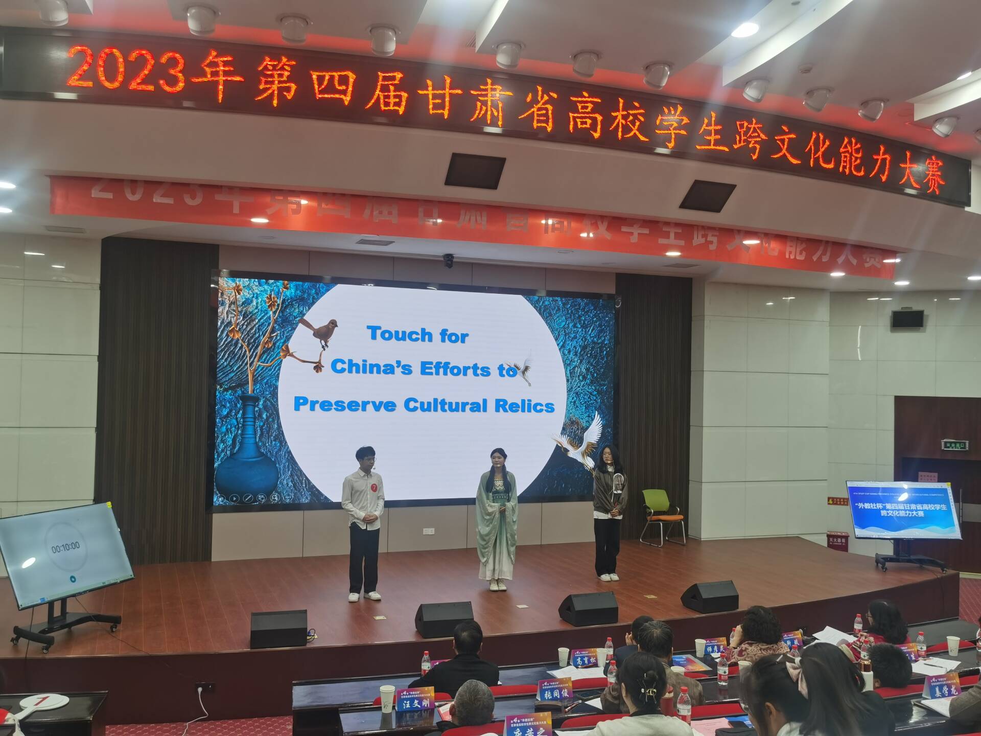10月14日,由甘肃省教育厅主办,兰州交通大学和上海外语教育出版社承办的第四届甘肃省高校学生跨文化能力大赛在兰州交通大学落下帷幕,省内19所高校代表队参加了比赛。经过案例展析、针对案例提问、跨文化知识提问三个环节的激烈角逐,由我校商英21班公钰莹、造价22班杨紫迪、车辆22-1班顾峻匡组成的代表队(指导教师:常转琴、何蓉、冉苒)荣获三等奖。