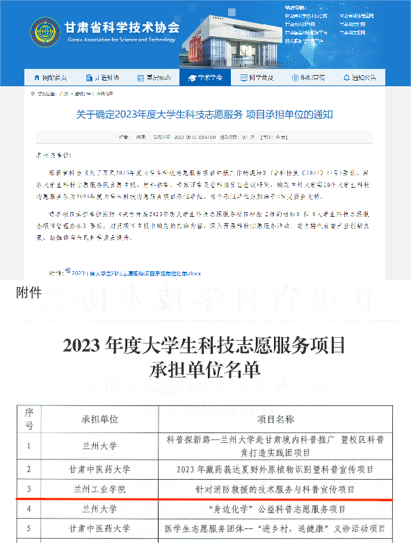 近日,甘肃省科协公布了2023年度大学生科技志愿服务项目评审结果。我校师生申报的《针对消防救援的技术服务与科普宣传项目》(项目负责人:罗文翠)获得立项资助。