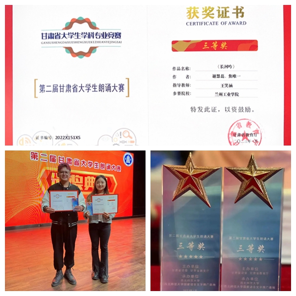 本次“雅言诵经典,永远跟党走”2022年第二届甘肃省大学生朗诵大赛由省教育厅主办,西北师范大学承办。我校通过校内选拔赛评选出前三名参加省级比赛。省级比赛共有从兰州大学、西北师范大学、兰州交通大学等19所高校遴选出的27部作品入围。决赛中,经各位评委严格评选、线上打分,共评出等级奖项17项,其中我校谢慧磊和焦唯一同学朗诵的作品《长河吟》荣获省级三等奖。
