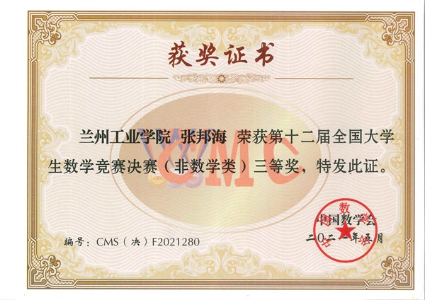 第十二届全国大学生数学竞赛决赛近日在吉林大学成功举行。本次竞赛全国共有32个赛区206921人报名参加初赛,选拔出668人进入决赛,实际参赛人数646人,其中,数学专业组343人,非数学专业组303人。经过激烈角逐,我校机械电子工程学院张邦海同学(指导教师:董珺)喜获国家非数学专业组三等奖。这是继我校汽车工程学院姜浩楠同学获国家非数学专业组三等奖之后,再次为学校赢得荣誉。