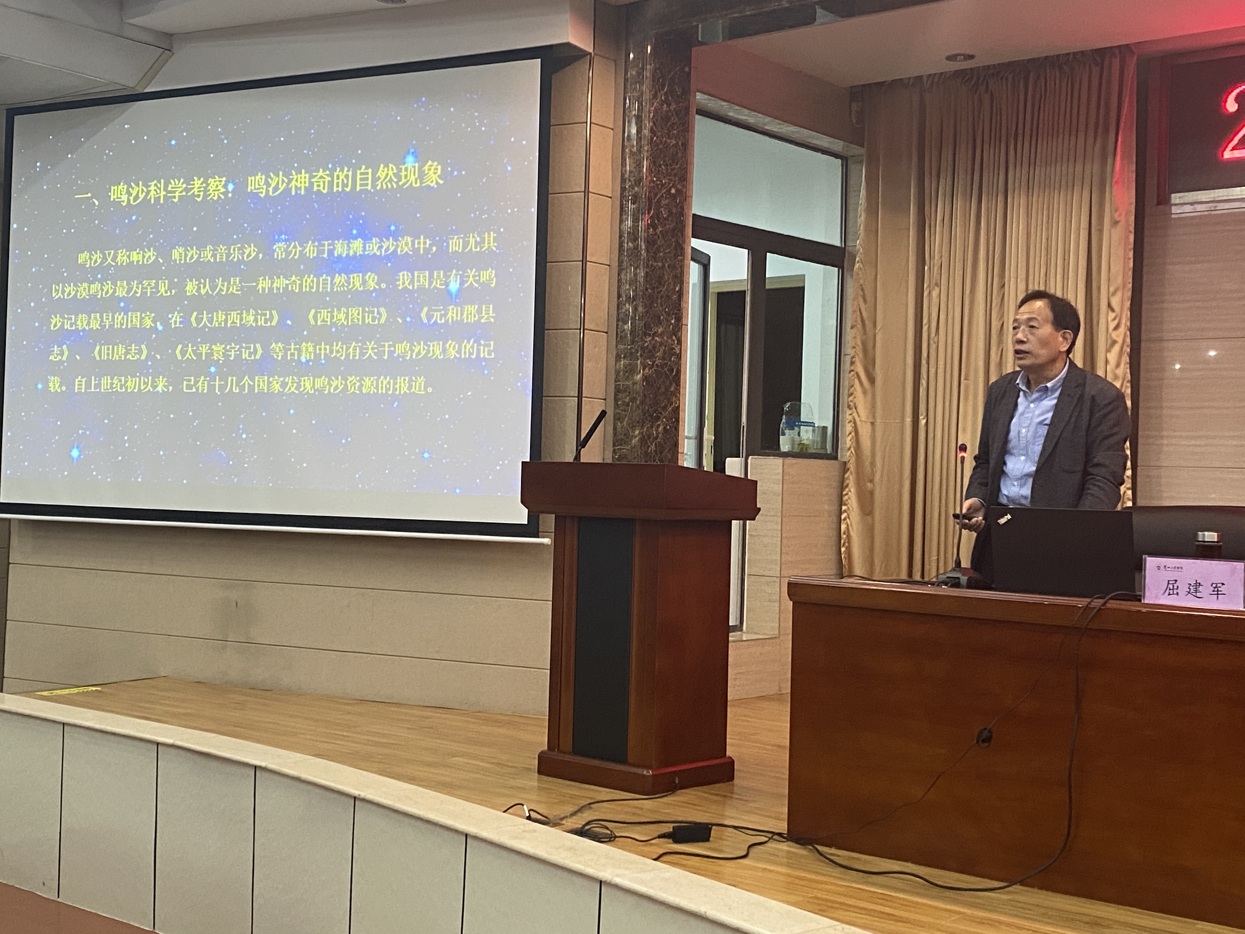 中国科学院冰川冻土研究所研究员屈建军应邀为与会人员作了“探索鸣沙的奥秘”学术讲座,在场师生认真学习报告内容。屈建军在学术上坚持不懈、认真钻研的科研精神深深感染与会师生,赢得了师生的欢迎。