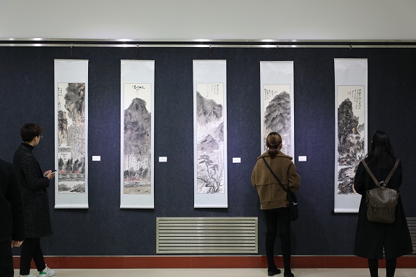 2018年11月6日, 由艺术设计学院主办的“峰”芒初露——赵峰个人水墨画作品展在图书馆一楼展厅举行。党委书记俞子泓出席作品展,党委宣传部部长张惠孔、艺术设计学院全体师生观看了作品展。 本次画展共展出艺术设计学院视觉传达设计16-1班学生赵峰51幅作品。作品中有传统水墨,也有实验水墨,有大幅有小品,笔法墨色之探索,内容题材之涉猎,缘自家学的渊源和自己的钻研努力,受益于学院开放的氛围和个性的鼓励,更表现出赵峰的才情与执着。 展览期间,还举办了书法笔会。俞子泓题词鼓励,希望艺术设计学院学子在艺术殿堂大胆创新、刻苦钻研,多出精品、多出佳作,同时要求师生各类艺术展览常态化,为学校美育教育和专业教学搭建更多、更丰富的平台。