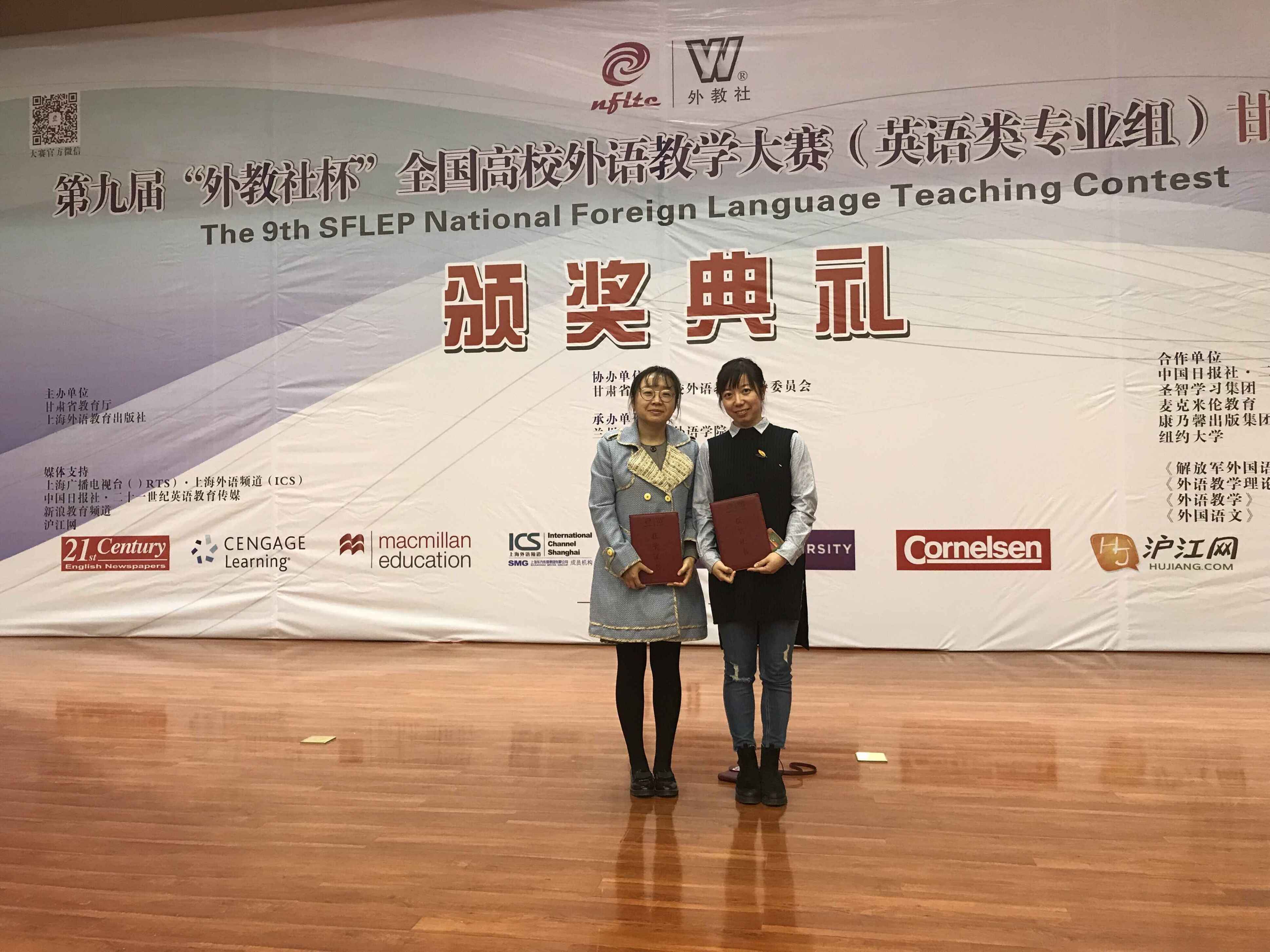 2018年10月13日至14日,由教育部高等学校外语专业教学指导委员会、教育部高等学校大学外语教学指导委员会、甘肃省教育厅、上海外语教育出版社共同主办,甘肃省高等学校外语教学指导委员会协办的第九届“外教社杯”全国高校外语教学大赛甘肃赛区比赛在兰州财经大学举行,省内21所本科院校、独立学院的38名教师参加了比赛。 我校外国语学院教师张蓓蓓、李晓琳分别参加“英语专业组”和“商务英语组”的复赛和决赛,经过现场授课、即兴说课、评委提问等环节的激烈角逐,张蓓蓓、李晓琳分获甘肃赛区英语专业组二等奖、商务英语组二等奖。