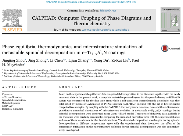 《CALPHAD》杂志是材料热、动力学及材料设计领域的国际权威杂志(SCI收录,JCR2区),每年从近千名专家学者的论文中评选出1篇最佳论文。周晶晶的工作采用CALPHAD方法首次构建了亚稳c-TiAlN基涂层的热力学数据库,并在此基础上通过Cahn-Hilliard模型对其调幅分解的微结构演化进行定量描述,为成分设计、工艺优化以及更高性能涂层开发提供重要的理论依据。