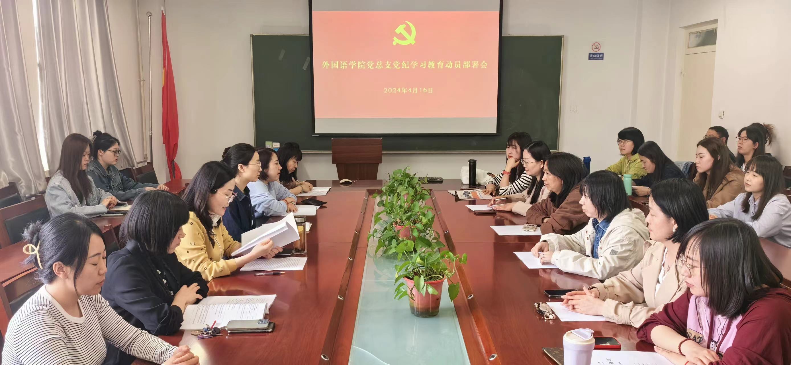 4月16日,外国语学院在学院会议室召开党纪学习教育动员部署会,认真学习习近平总书记关于党纪学习教育的重要讲话和重要指示精神,传达中央和省委以及学校关于开展党纪学习教育的工作要求,部署学院党纪学习教育工作。院长刘玮主持会议并作动员讲话,全院师生党员参加会议。