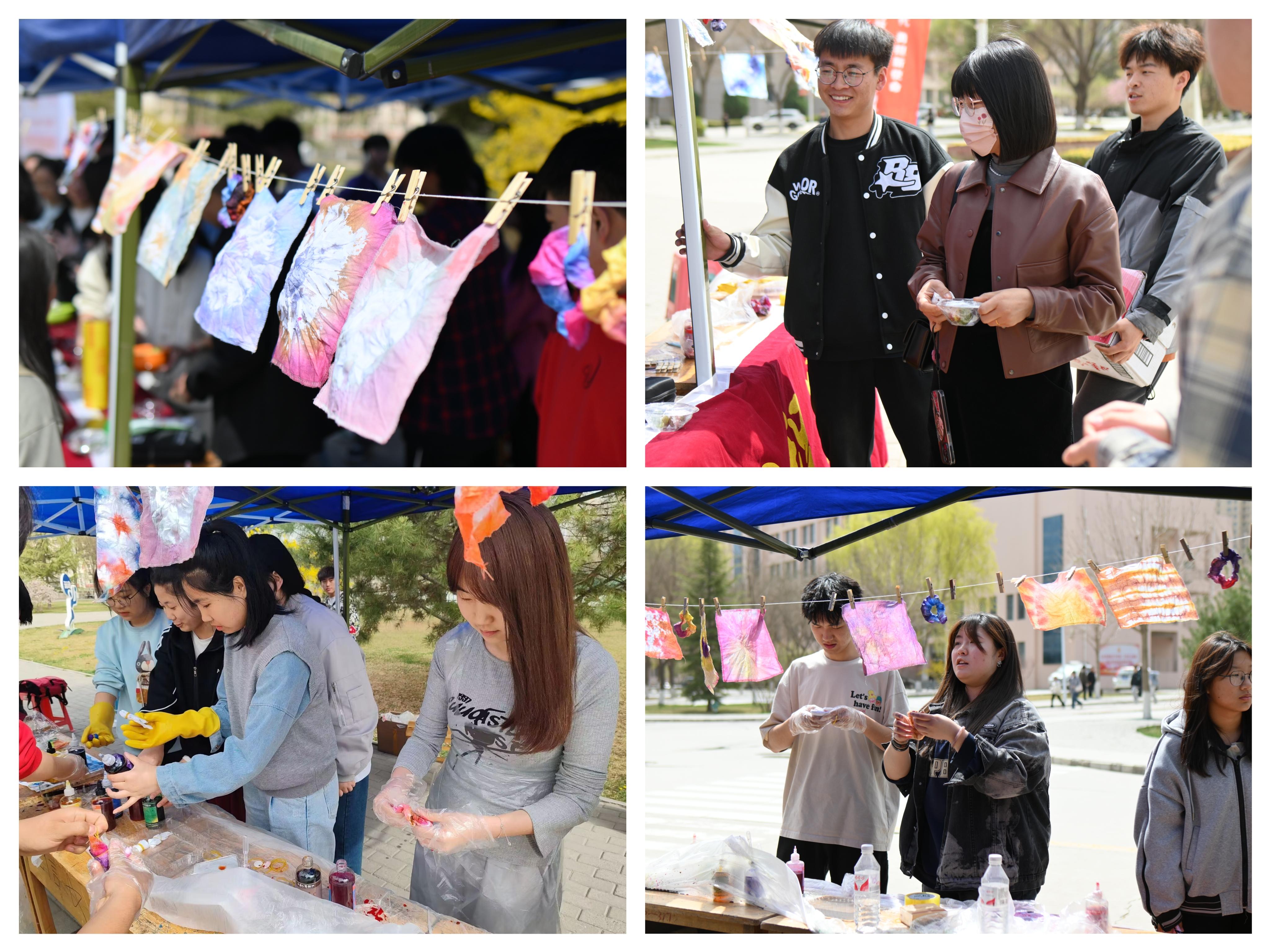 清明扎染是一种古老而精细的染色工艺,古时人们会选择桃花、柳树等一些有代表性的图案,通过扎染技艺将其展现在织物上,制作成精美而独特的服饰、布艺和其他装饰品。学院志愿者们从扎染起源、艺术价值、扎染流程到常见的扎染手法逐一展开介绍,围观师生们听得津津有味……大家发挥想象与智慧,亲自动手创造出各种图案作品。这些作品不仅富有浓厚的传统文化氛围,还充满了生机和希望。